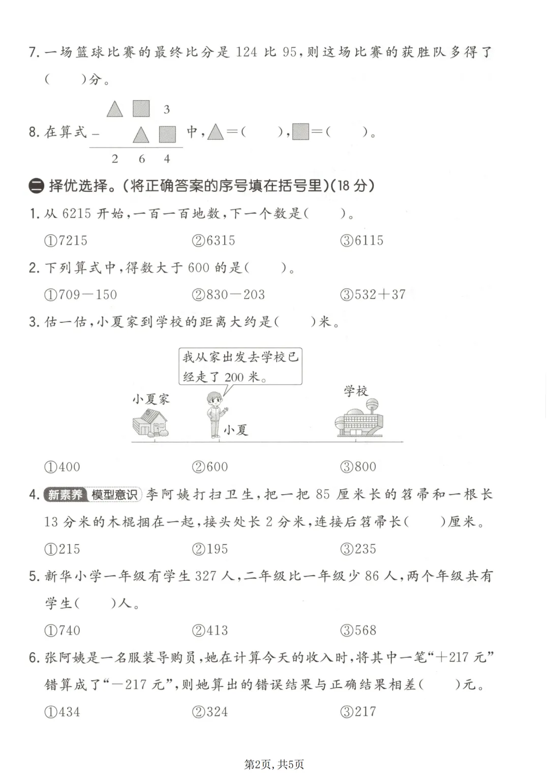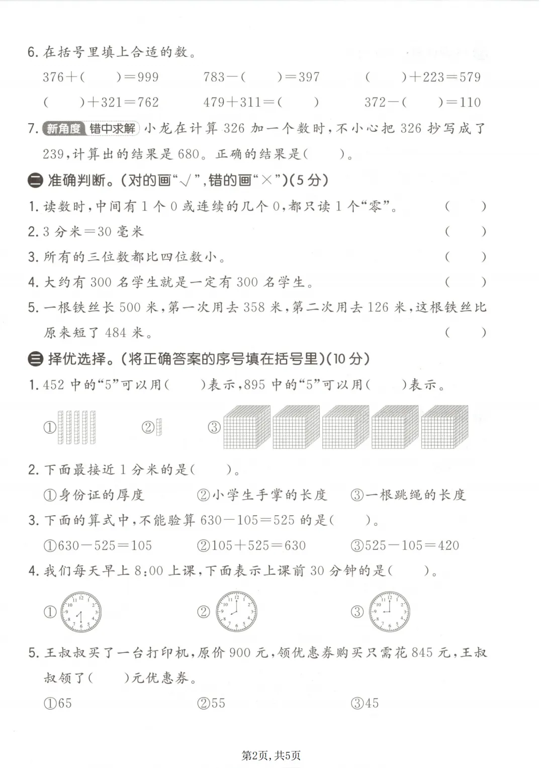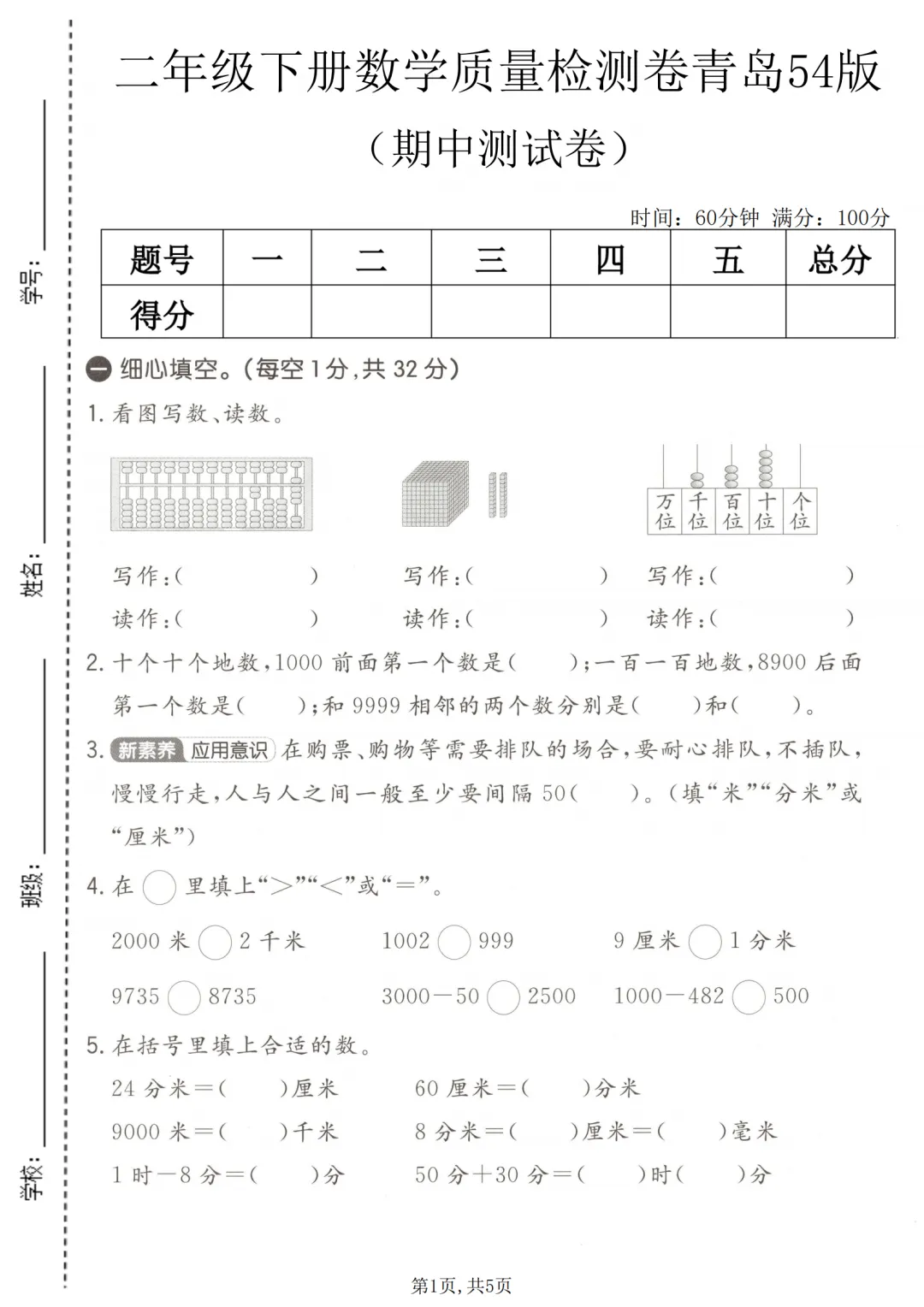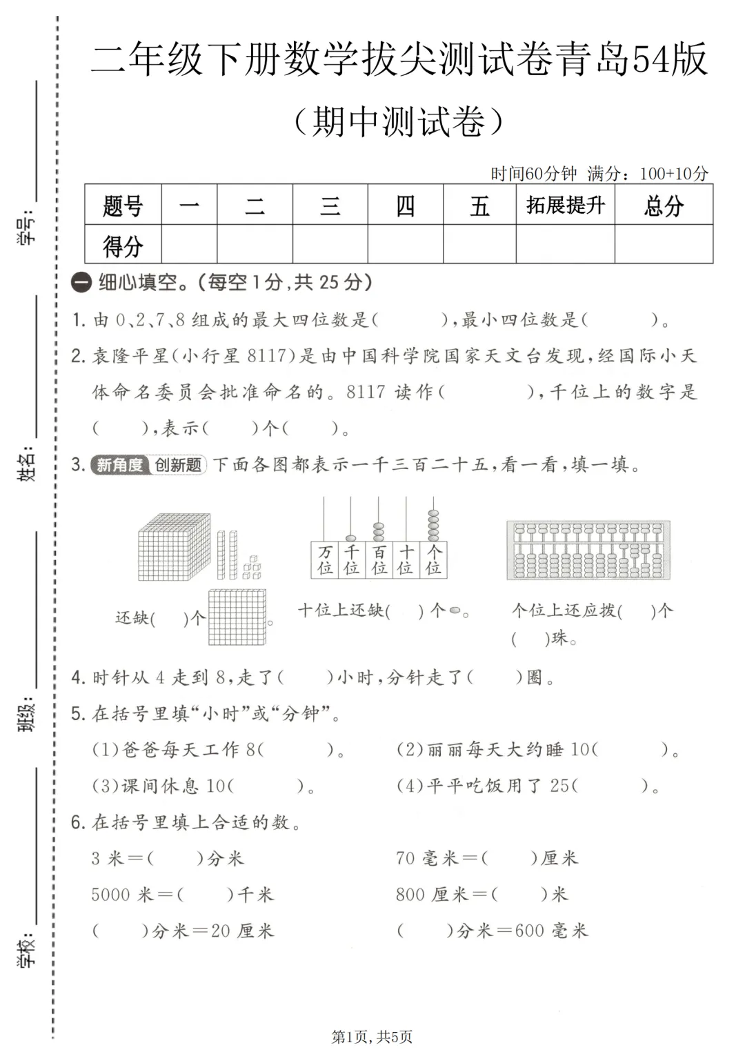26年春新版二年级(下)数学青岛54版期中拔尖测试卷。精准适配教材与考情:试卷严格依据青岛 54 制数学教材大纲编写,深度贴合青岛本地校内小测与统考命题趋势,覆盖万以内数的认识、万以内加减法、时分秒的认识、图形与拼组、混合运算等核心知识点,题型和难度梯度与二年级学生的认知规律和学习特点相匹配。分层设计兼顾不同需求:采用基础过关卷 + 拔尖提升卷的科学分层设计。基础过关卷聚焦口算、竖式计算、基础填空等常规题型,帮助孩子夯实计算、概念、单位换算等核心根基,杜绝基础题型粗心失分;拔尖提升卷在基础之上适度拓展延伸,侧重知识灵活运用、易错点强化和解题技巧训练,循序渐进锻炼孩子的数学思维和知识迁移能力,适合想要巩固拔高、冲刺高分的孩子。全面覆盖学习场景:试卷结构科学完整,分为单元分层卷、专项突破卷、期中全真模拟卷等板块,一站式覆盖全学期测、练、评、考所有需求。期中全真模拟卷仿照青岛本地校内统考题型、题量、时长和分值设置,搭配直观图示辅助理解题意,帮助孩子提前适应考试节奏,养成认真审题、工整书写、做完检查的良好应试习惯。需要的家长抓紧打印出来,让孩子写一写,练一练吧。