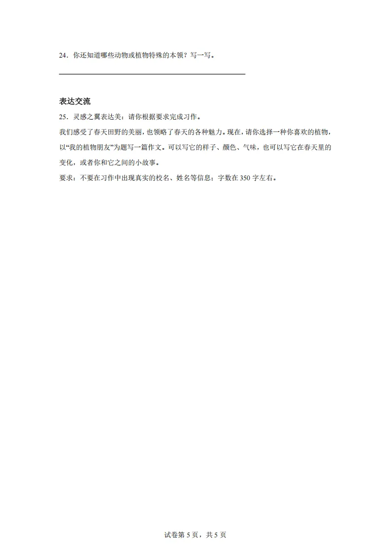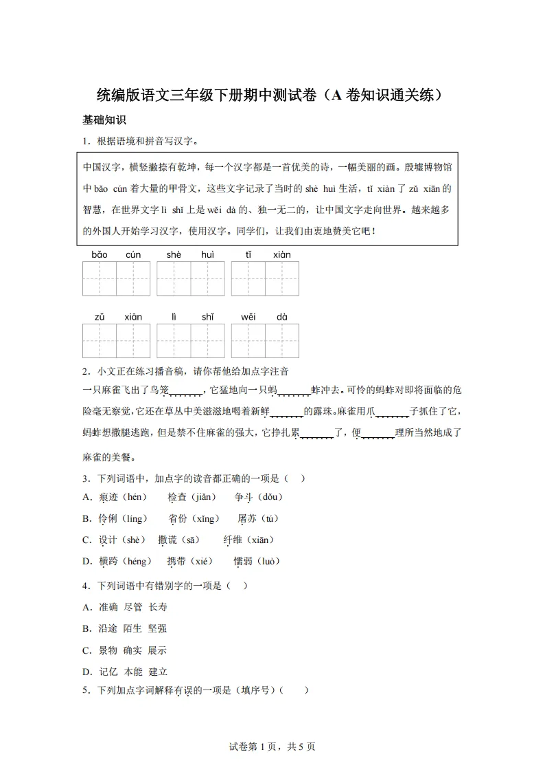专项练习 I 统编版语文三年级下册期中测试卷(A卷知识通关练) 可下载打印