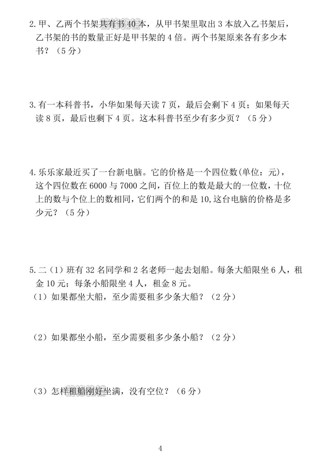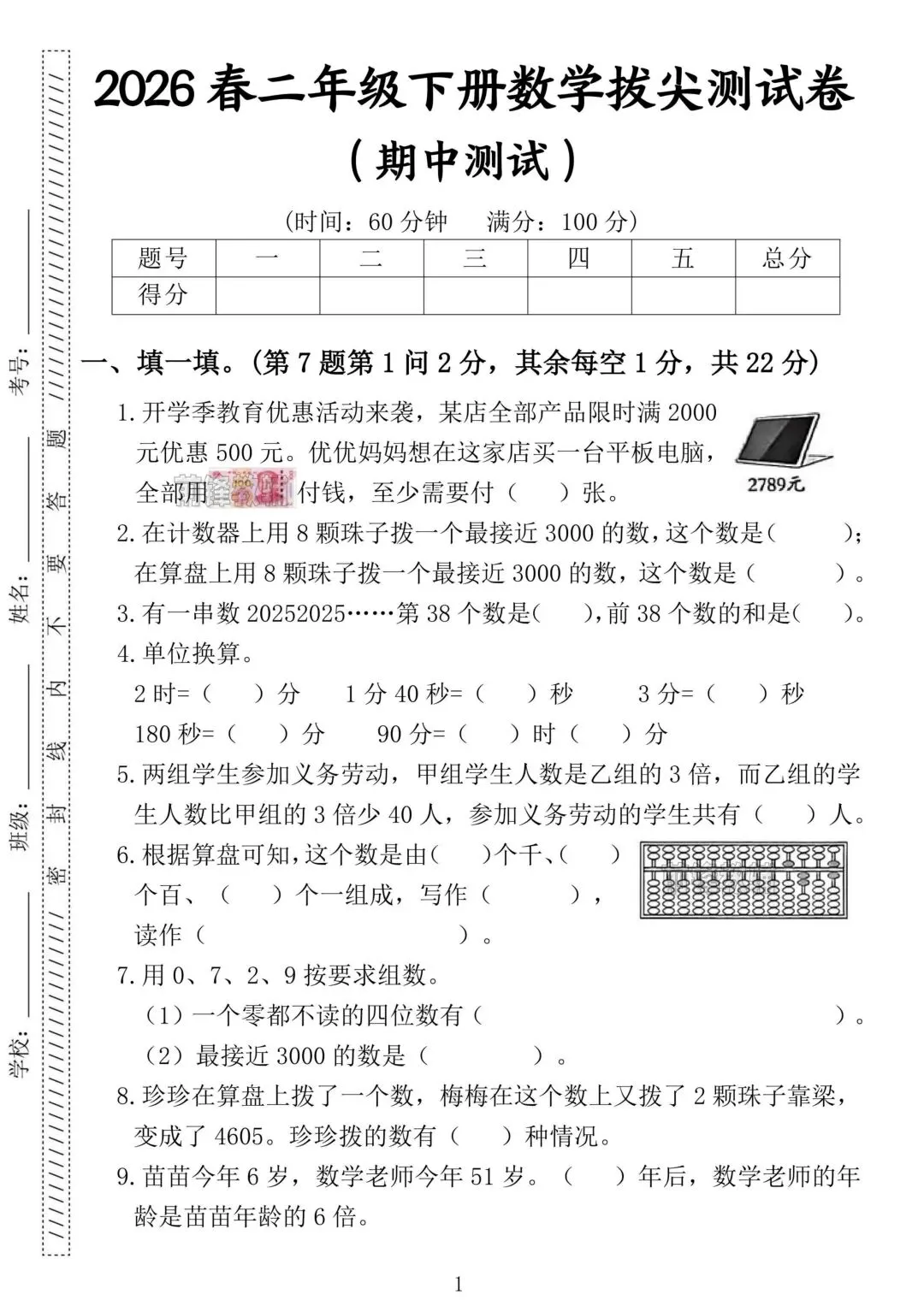 老师刚整理的!二年级下册数学期中拔尖测试卷(共5页)!家长看文末领取方式,给孩子领回去打印出来练习吧!