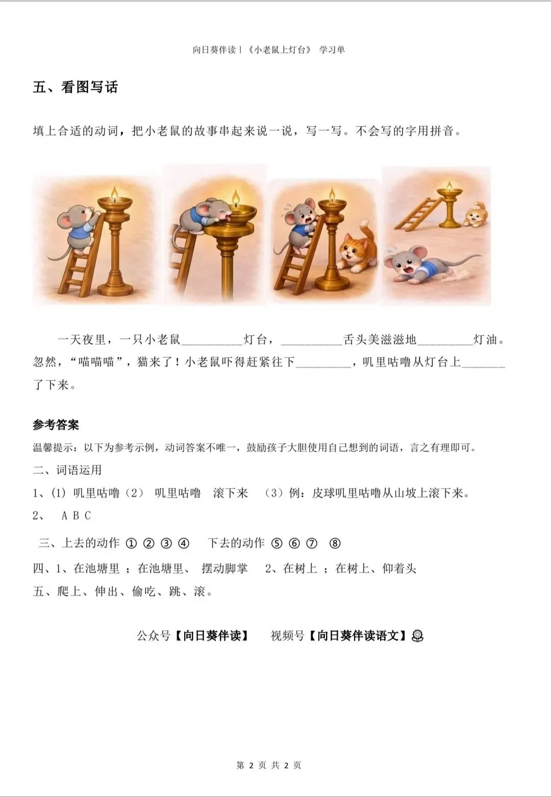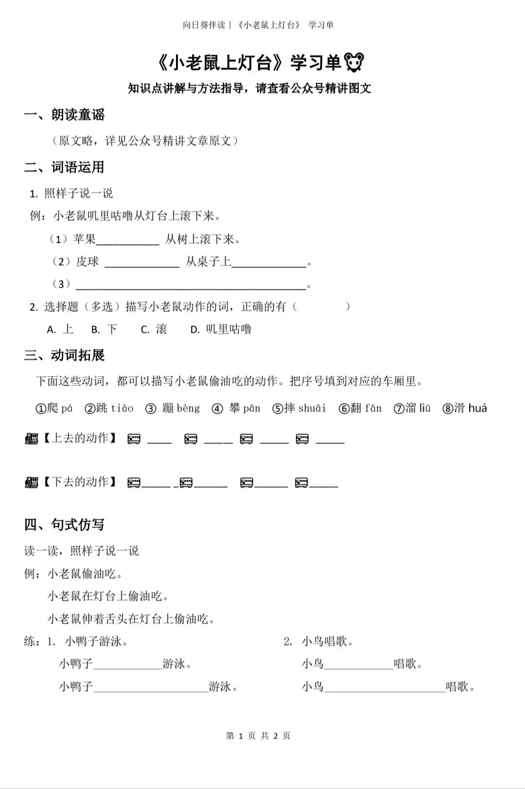 之前和大家分享了《小老鼠上灯台》童谣精讲,很多家长想要清晰可打印的学习单,今天给大家更新上,聚焦动词积累 + 句式仿写 + 看图写话,孩子练起来更高效~