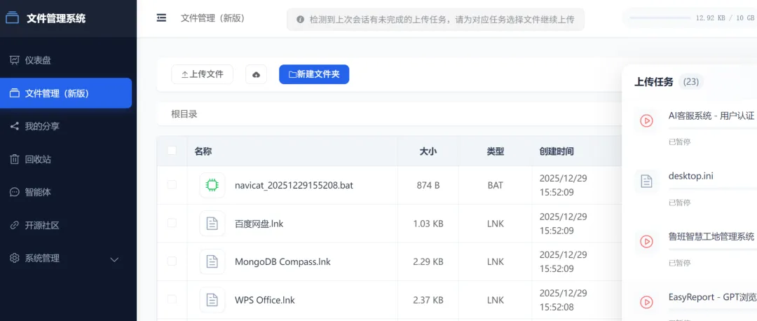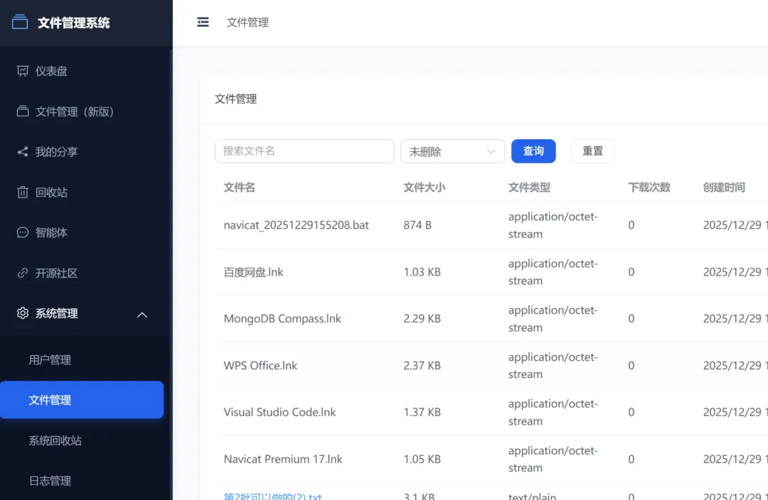 在数字化办公浪潮中,文件管理是企业协作的核心痛点之一。传统网盘功能单一、安全性不足,而商业软件成本高昂?今天为大家推荐一款开源免费、企业级安全、开箱即用的文件管理系统——基于 Spring Boot 3.2 + Vue 3 构建,支持 Docker 容器化部署,覆盖中小团队全场景需求!