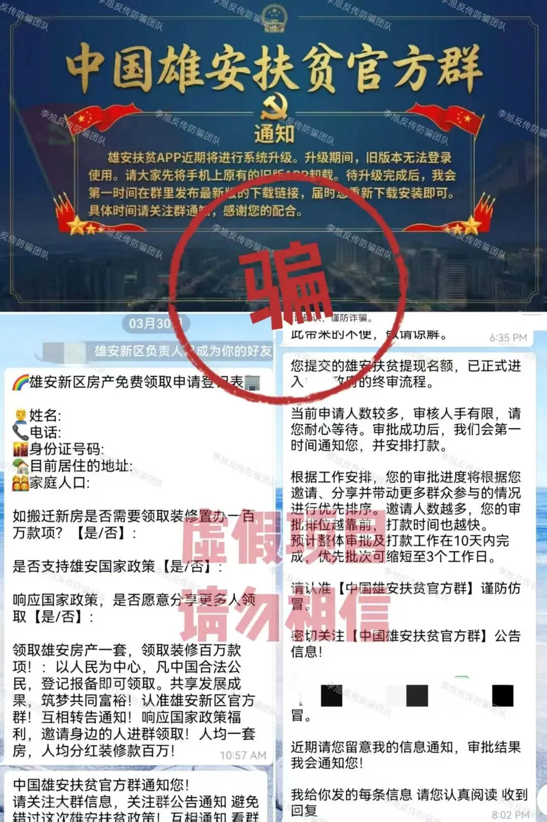 蹭“雄安新区”政策热点出现的虚假项目。打着“国家”旗号,声称参与者可免费领取巨额扶贫款和房产,以此套取用户信息。
