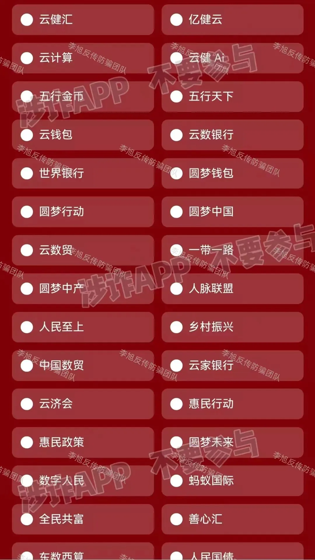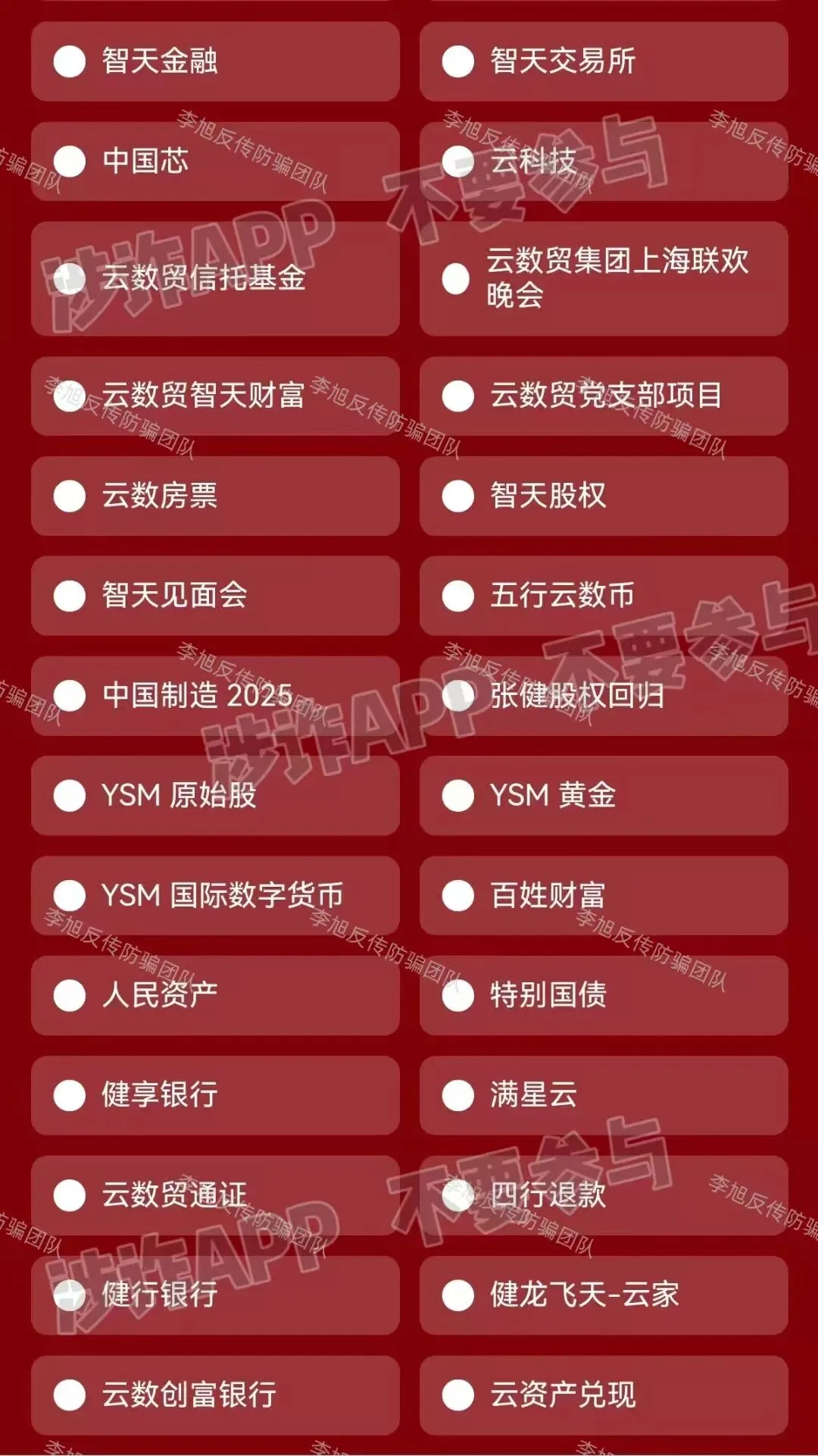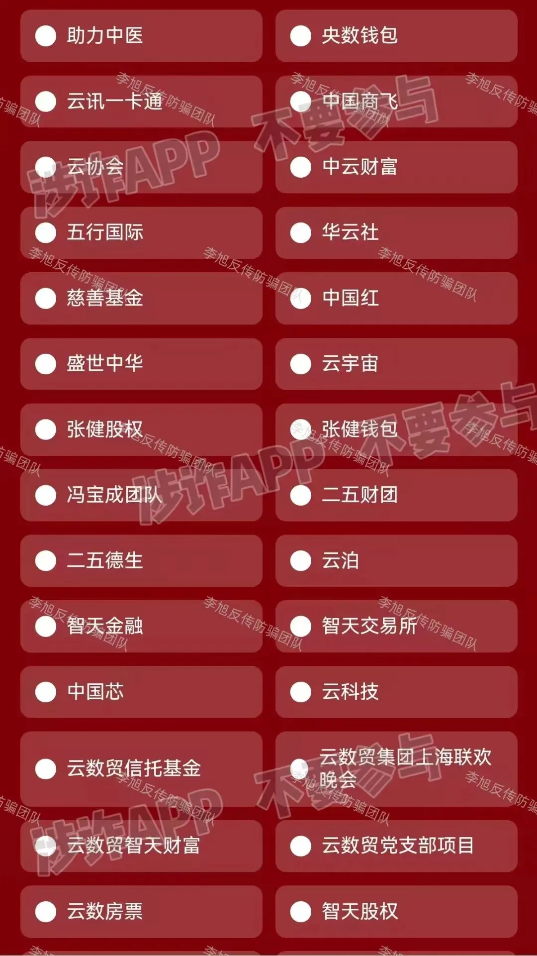 另外,在我们总结今天的案例过程中,发现了堪称“骗子界最有自知之明”的一位。一个打着“清退”旗号的虚假软件中,罗列了大量号称可以“清退”的项目。虽然“退赔”是假,但这个名单却像一份“骗局指南”,上面列出的名字,几乎都是无法兑现任何承诺的陷阱和资金盘。这也从侧面印证了这些项目的性质。骗子自己,有时反而“最懂行”。图片奉上,大家可以自行查看,尽早远离!