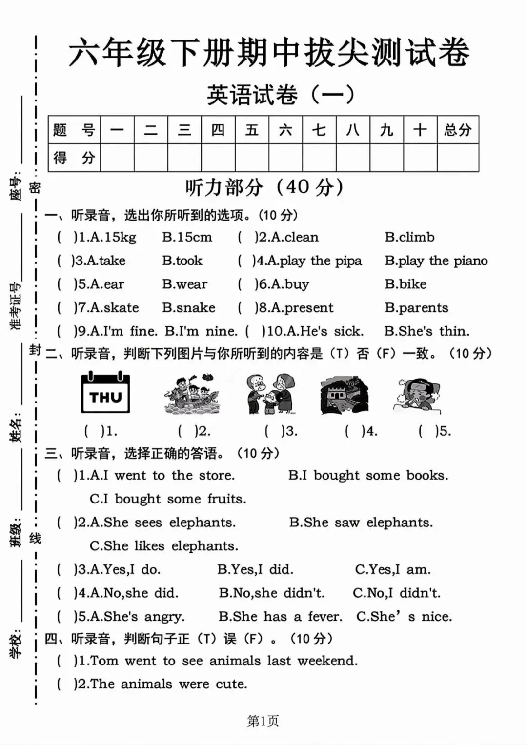 专项练习|26春 小学英语 人教PEP版《期中质量检测卷》共5套含答案,六年级下册 ,附链接可下载打印-拷贝