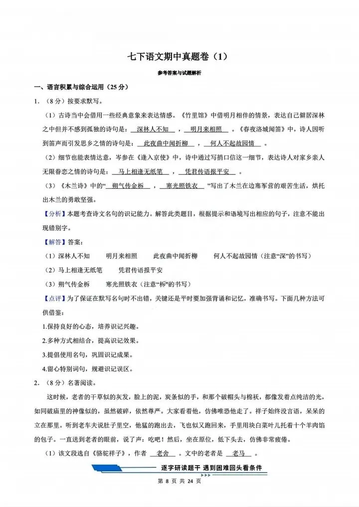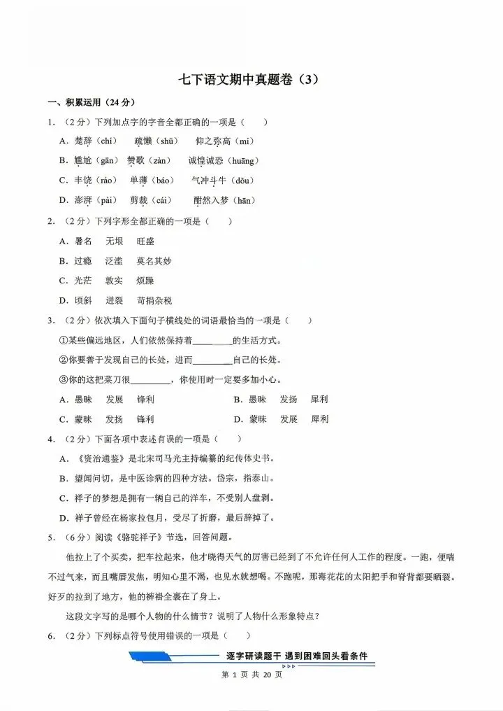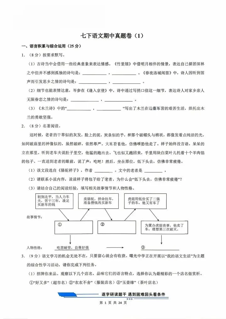 2025-2026学年春季七年级下册语文《期中测试卷》3套,含答案和解析,电子版可下载,可打印。这套七年级下册语文期中测试卷,帮助孩子检测知识掌握情况,查漏补缺,备考期中考试。