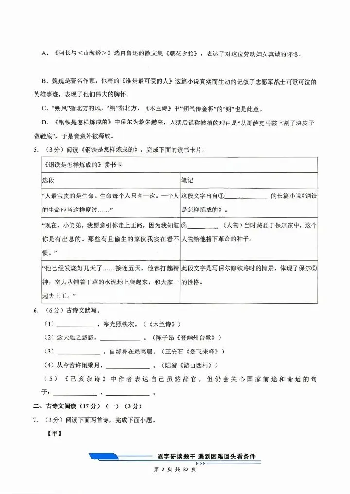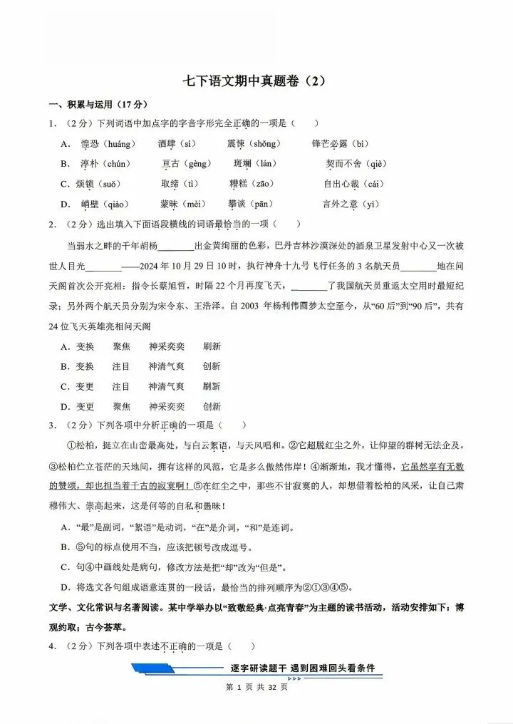 【七下语文】26年春部编版语文七年级下册《期中测试卷》3套,含答案和解析,可打印