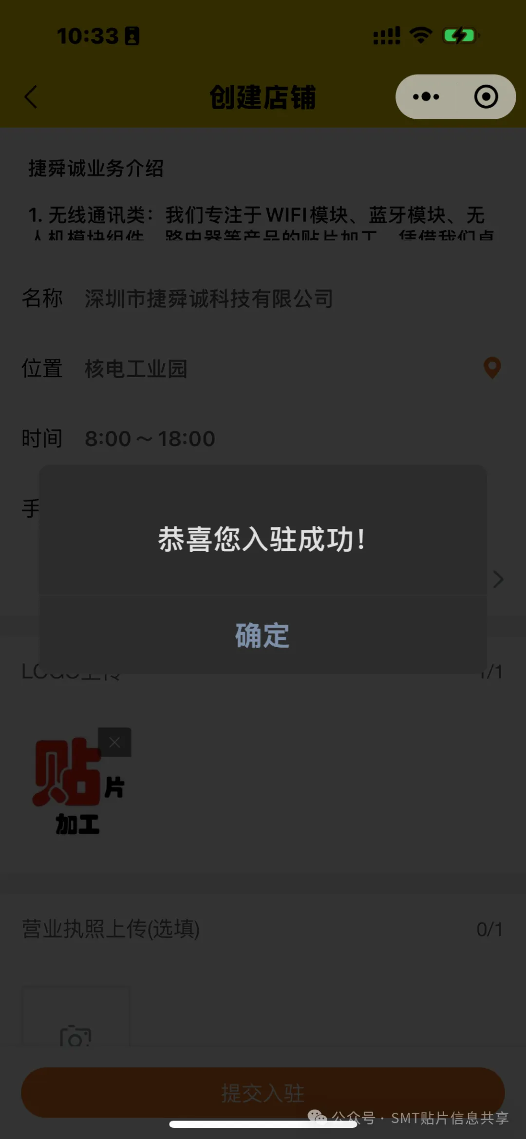 8.内容填写完成点击提交入驻,会显示入驻成功标识。再次进入商铺更新产品也是同样的步骤。