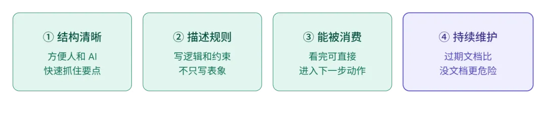 当然,不是所有文档一夜之间都会自动升级成生产资料。有些文档依然只是存档,有些文档依然只是留痕,有些文档依然写完就躺。真正能进入生产链条的文档,通常至少要满足四个条件:结构清晰,是让人和 AI 都能快速抓住:背景是什么,目标是什么,范围是什么,规则是什么,异常是什么,验收标准是什么。描述规则,是因为 AI 更需要逻辑和约束,而不是表面现象——”页面上有一个按钮”的生产价值,远不如”按钮在什么条件下显示、点击后触发什么逻辑、失败后如何处理”。能被消费,是指看完以后可以直接进入下一步动作:拆任务、写代码、生成测试点、接入自动化流程。持续维护,是因为一份过期文档不只是没用,很多时候比没文档更危险——它会提供错误上下文,让 AI 把旧信息当成事实去推理,团队反而要付出更高的返工成本。