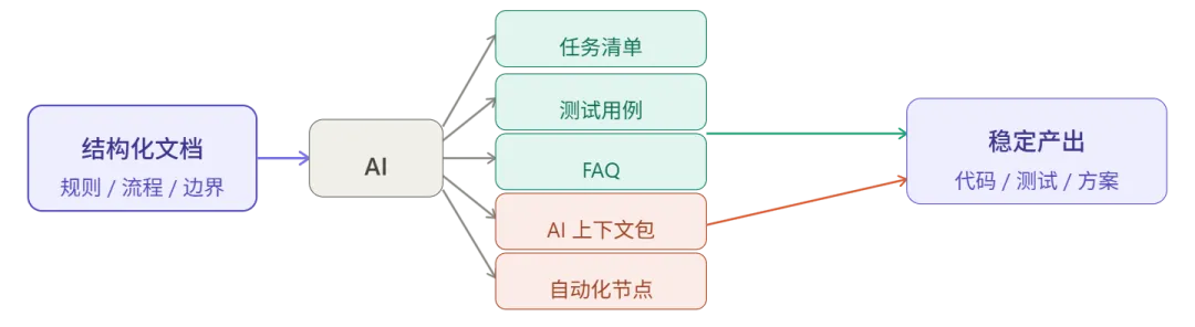 很多团队现在还停留在一个旧逻辑里:文档是辅助项,代码和交付才是主项。如果继续这么理解,后面会越来越难受。因为一旦文档开始进入 AI 流程,它就直接影响 AI 输出质量、团队对齐效率、协作成本、知识复用能力、新人接手速度和流程自动化程度。真正把文档当生产资料的团队,通常会做四件事:优先维护高频、高价值文档。不是所有文档都要重投入。优先级要集中在最容易进入生产链的内容上:需求规则文档、接口和数据定义、流程说明、测试标准、技术决策记录、常见异常与处理规则、关键业务约束。这些文档最容易被多次调用,价值也最高。统一关键文档结构。如果每个人写法都不同,AI 和人都很难稳定使用。团队至少要让关键文档具备统一框架,核心要素保持一致。这样人接手更快,AI 检索更稳,流程接入更容易,维护成本也更低。把文档嵌进流程,不再靠自觉维护。只靠”谁比较认真谁去补”,这套方式一定撑不久。需求评审前必须补齐范围和规则,联调前必须确认接口定义,变更上线后必须同步关键差异,复盘完成后必须补充异常和经验。只有这样,文档才不会永远停留在”有空再写”。让文档直接连接后续产出。最能改变团队态度的,不是再强调一次”文档很重要”,而是让大家亲眼看到它能直接转成结果:从文档生成任务清单,从文档生成测试点,从文档生成 FAQ,从文档生成 AI 上下文包。一旦这种转换关系被建立起来,文档的价值感会立刻上升。
