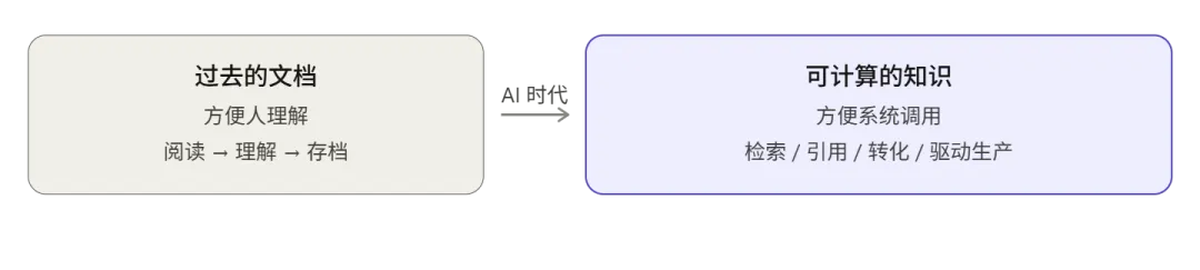 这是一个很重要的趋势。过去文档的价值,更像是”方便人理解”。以后文档的价值,会越来越多地体现为”方便系统调用”。它能被检索,能被引用,能被拆分,能被结构化提取,能进入自动化流程,能作为模型推理的上下文来源,能参与任务生成、测试生成、方案生成和知识问答。到这个阶段,文档其实已经不只是文档了。它更像是一种”可计算的知识”。谁能把知识写成能被系统消费的形式,谁就更容易把 AI 真正接进生产。这也是为什么,很多团队接下来最值得升级的,不只是 AI 工具栈,还有自己的知识表达方式。因为工具再强,如果喂进去的是模糊、零散、过期的信息,最后产出仍然会飘。相反,如果团队有一套高质量的文档底座,同样的模型、同样的工具,在你这里的效果就会明显更稳。