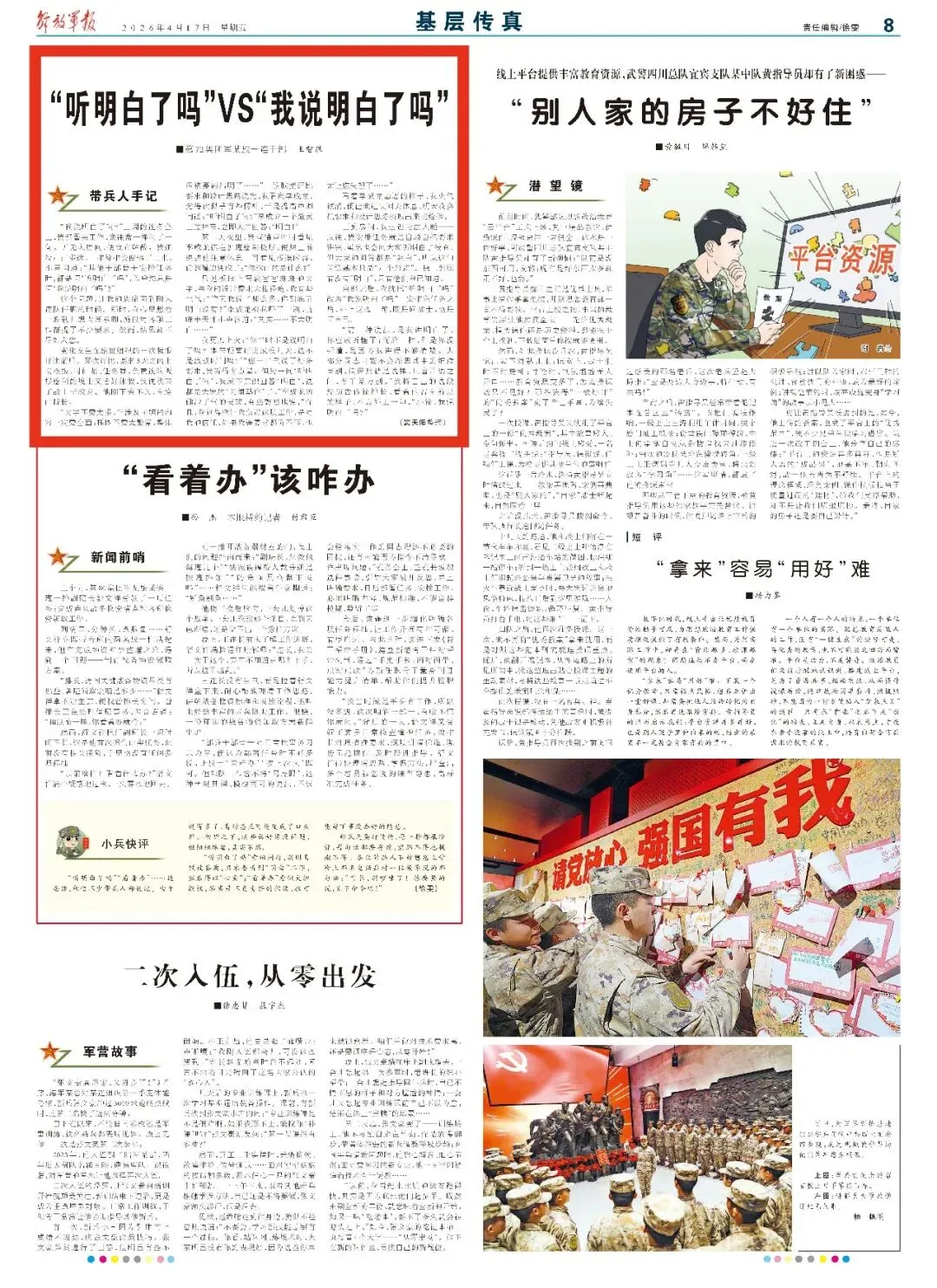 “我说明白了吗?”上周的连务会上,我部署完工作,像往常一样问了一句。见无人提问,便宣布解散。我还没走出多远,二排徐排长便追了上来,小声问道:“其他干部骨干安排任务时,都是问‘听明白了吗’,为啥您总是问‘我说明白了吗’?”