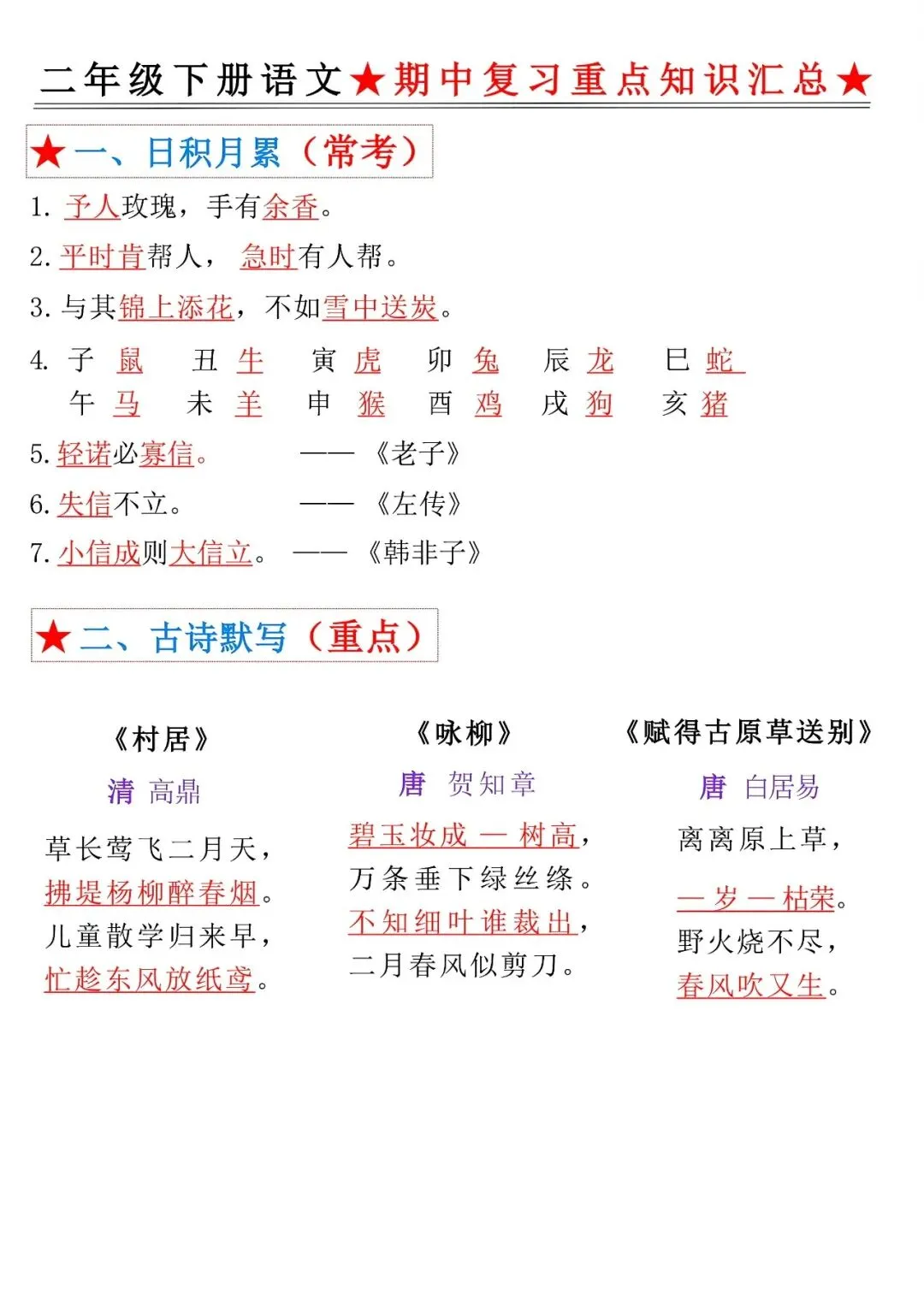 今天分享的是:二年级下册语文期中复习重点知识汇总。这套资料整理汇总了二下语文1-4单元的必背的知识点,包含了每课重点生字词、注音组词、需要背诵的课文等内容,可以作为晨读晚诵材料使用,是非常不错的期中课内复习资料!