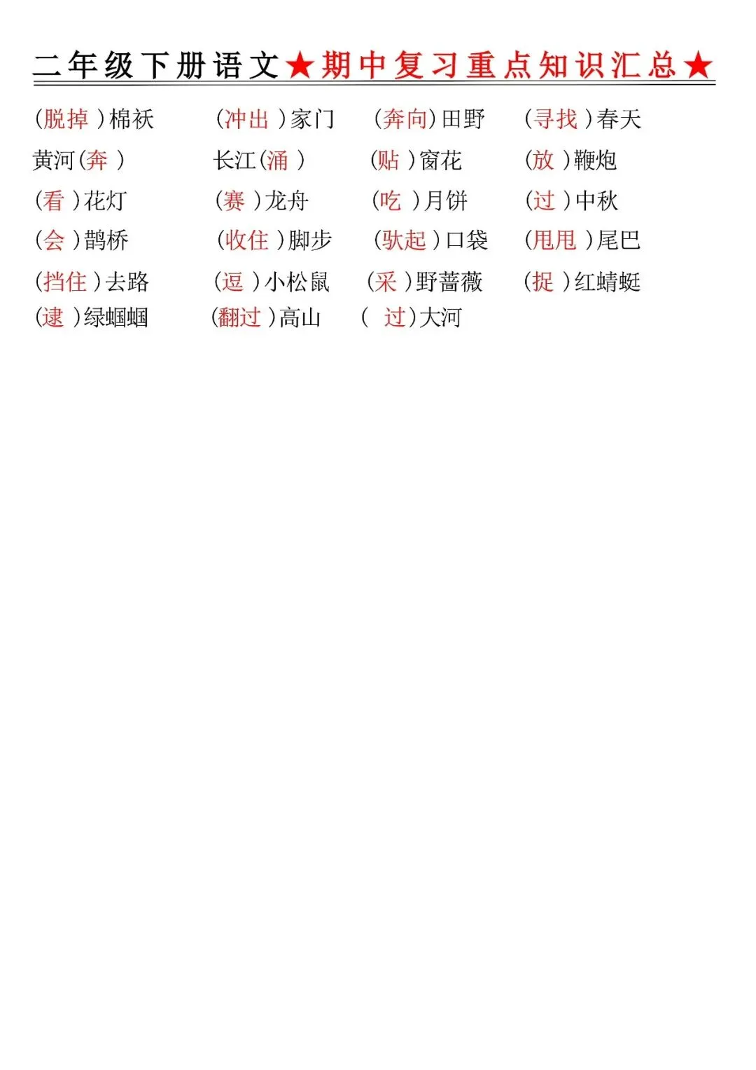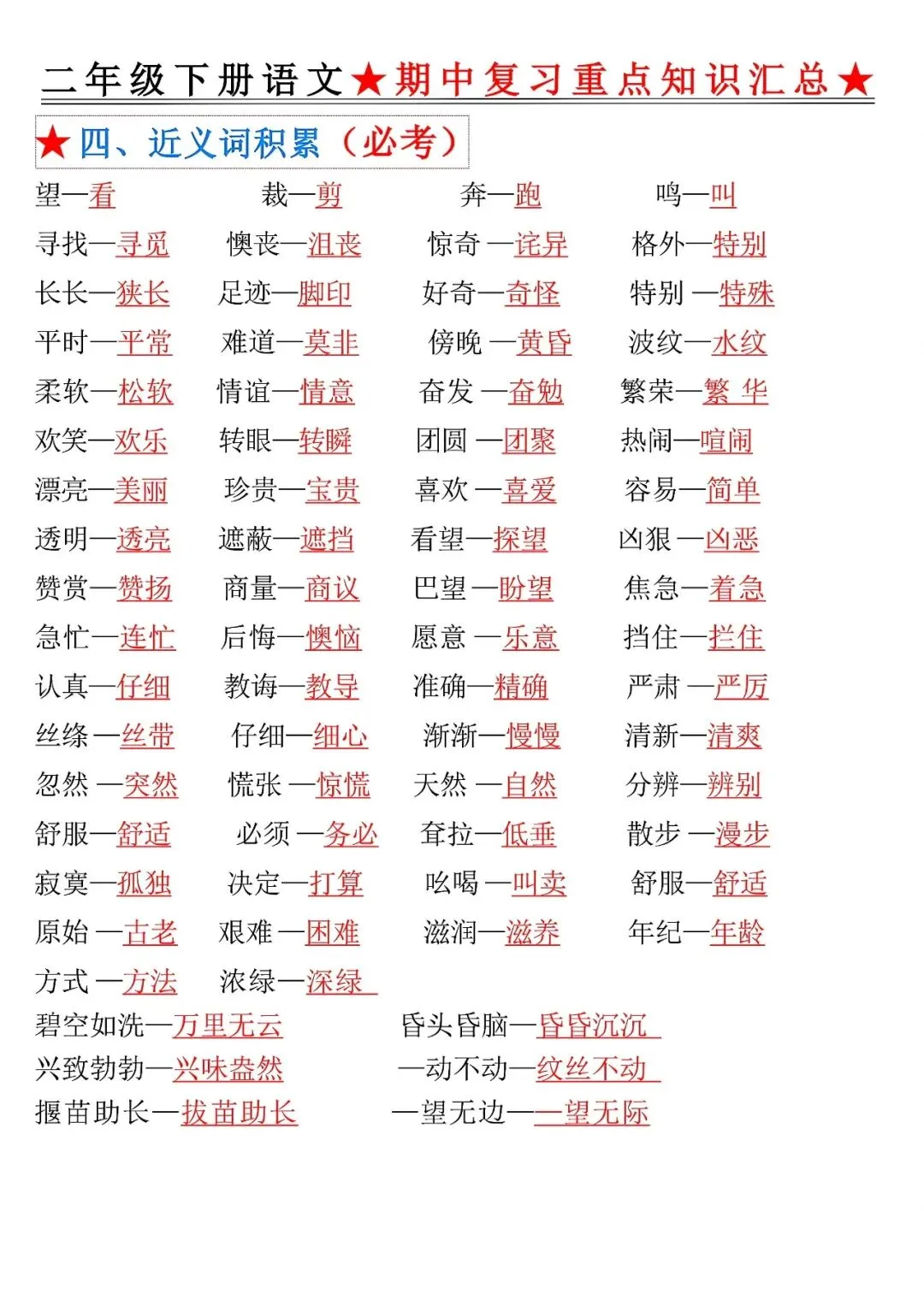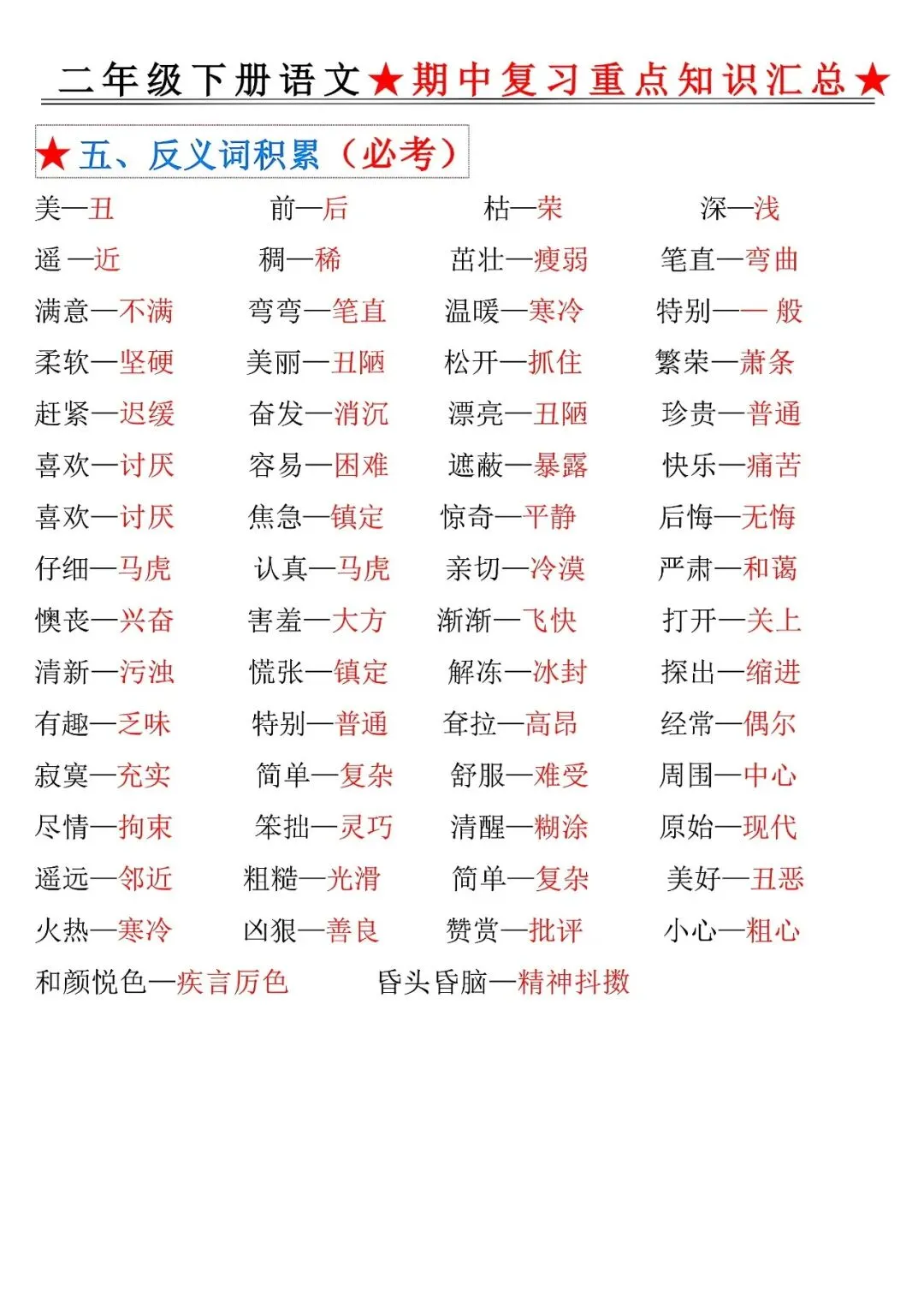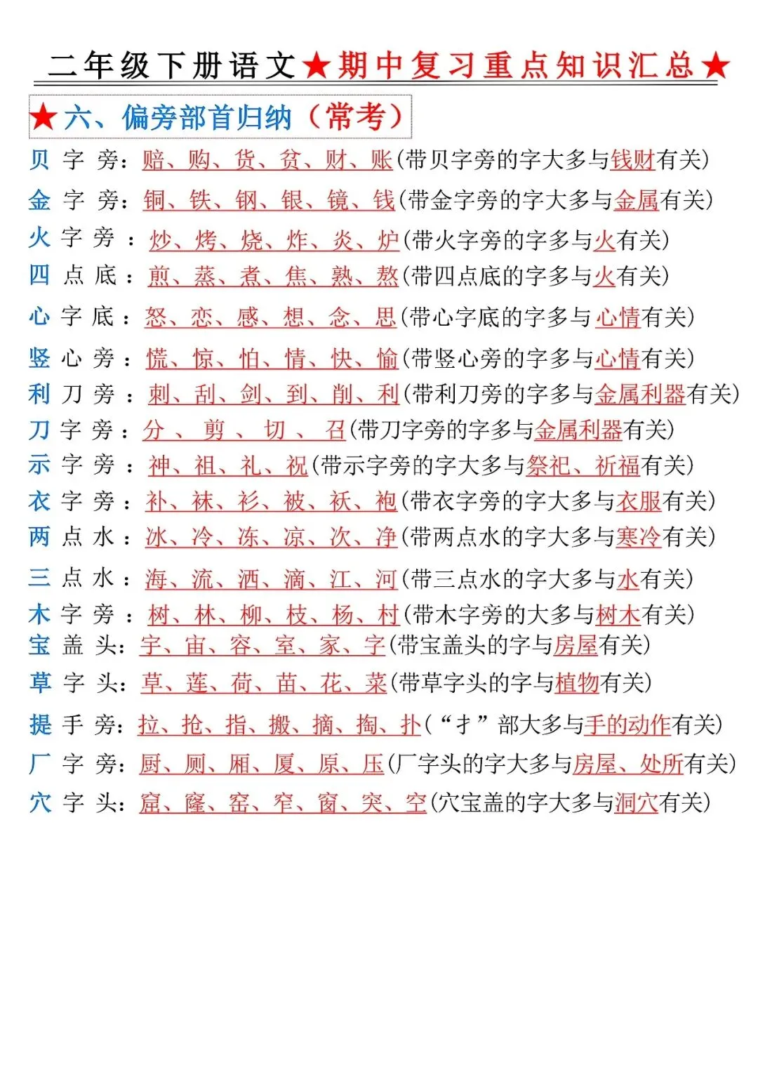 二年级下册语文期中复习重点知识汇总,电子版可打印