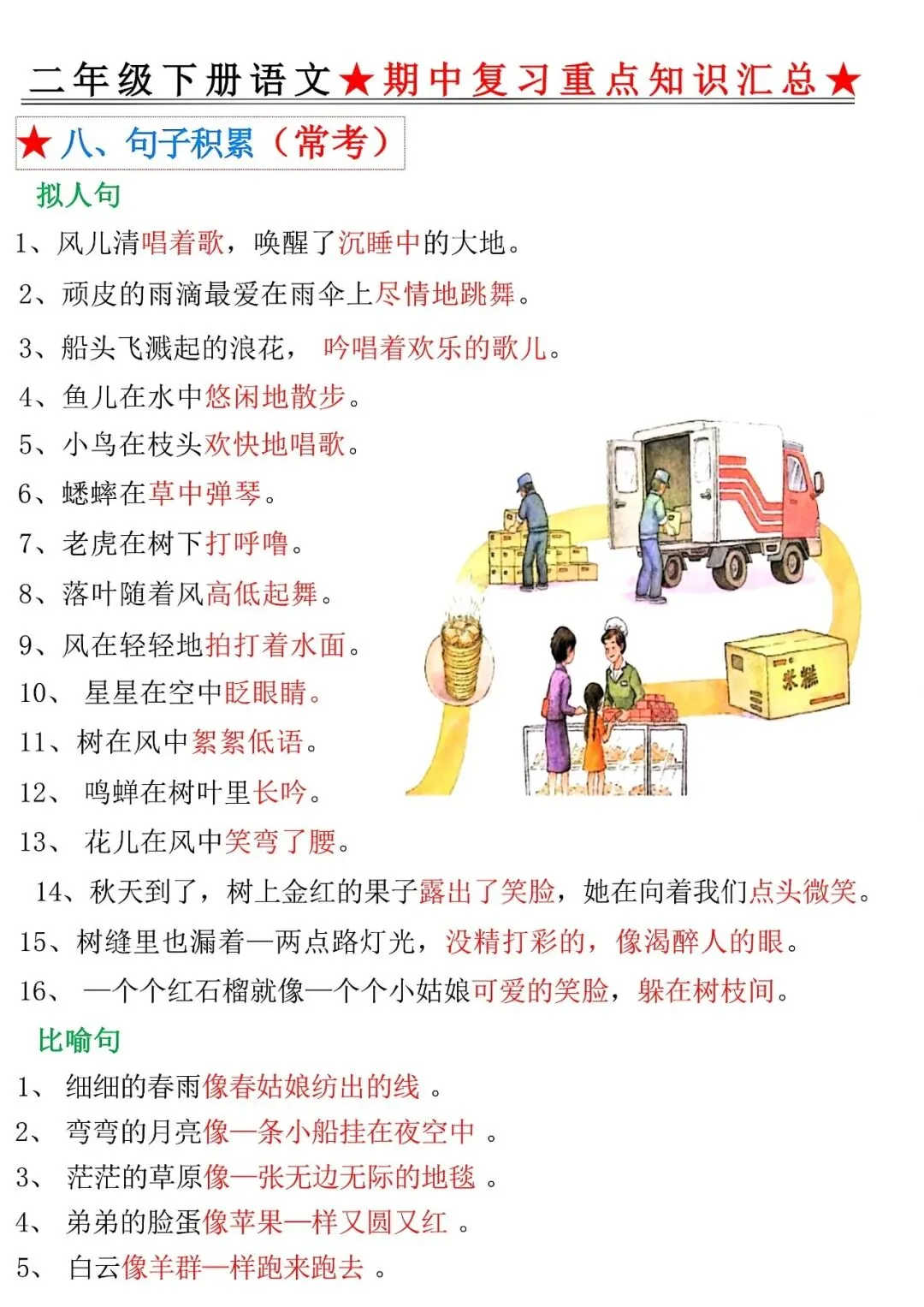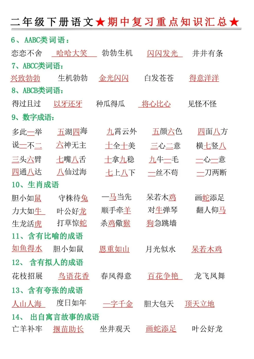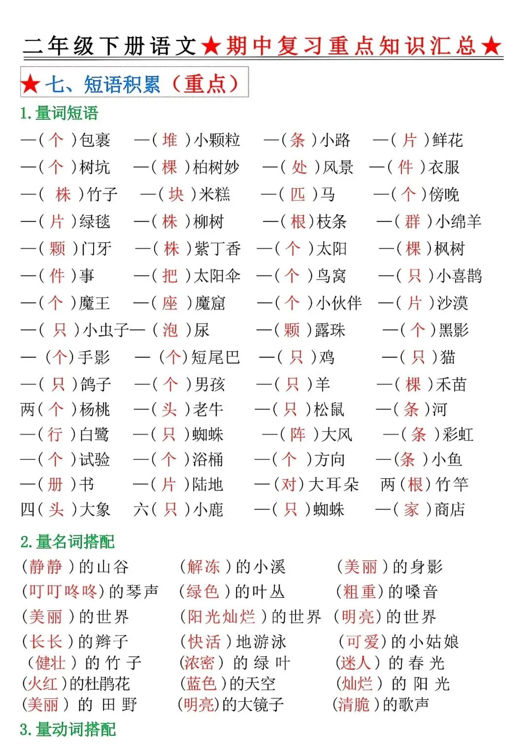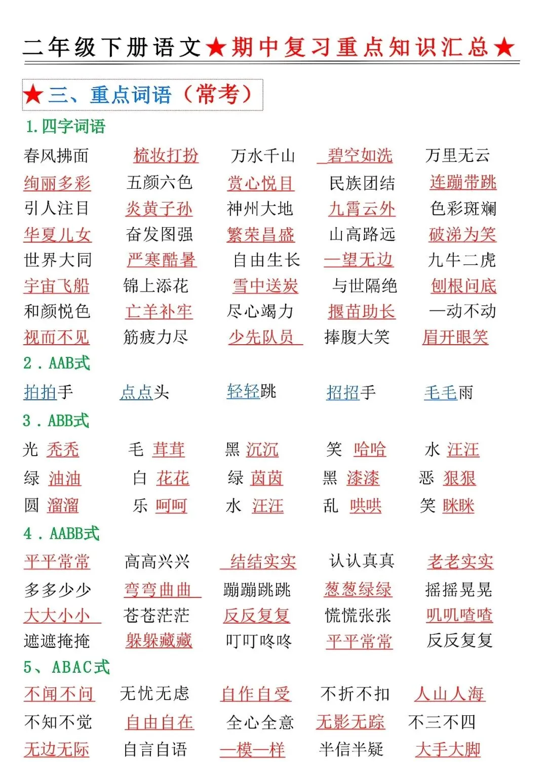 二年级下册语文期中复习重点知识汇总,电子版可打印