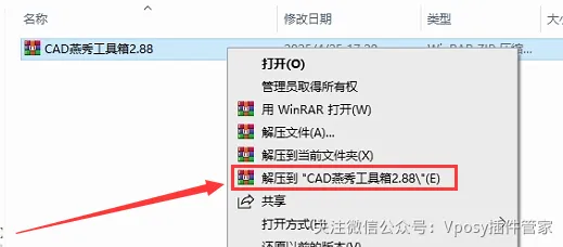 1.解压安装包:①鼠标右击【AutoCAD-燕秀工具箱】压缩包②选择电脑上安装的解压软件(如:WinRAR)③点击【解压到AutoCAD-燕秀工具箱】。