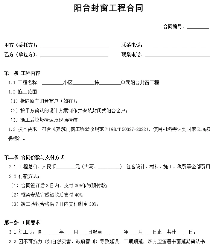 1.1 工程名称:_________小区______栋______单元阳台封闭门窗安装工程