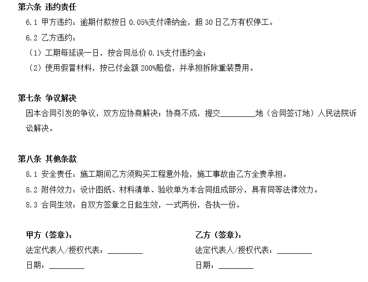 2.1 本工程固定总价:人民币________元(大写:_____________________),该价款为包干价,包含设计、材料、加工、运输、安装、辅材、人工、机械、检测、安全措施、管理费、税金等全部费用,除双方书面确认外,不作任何调整。