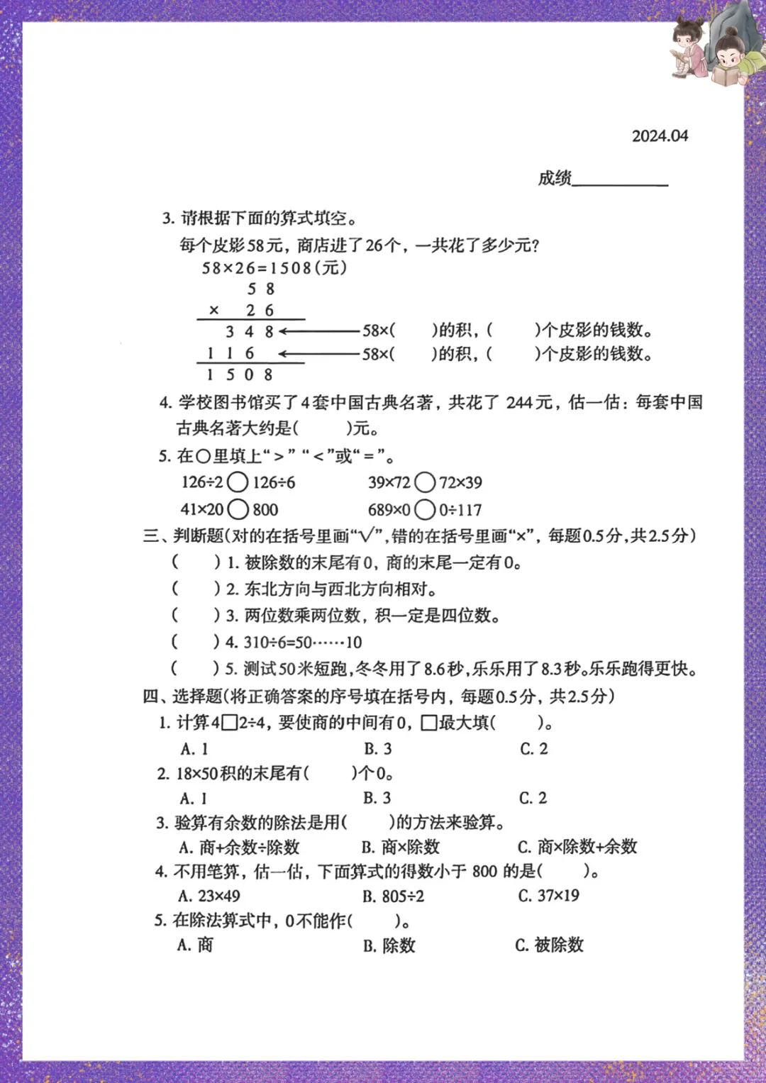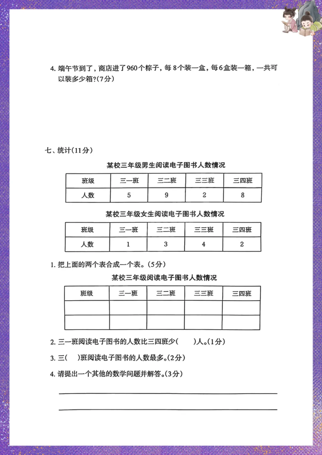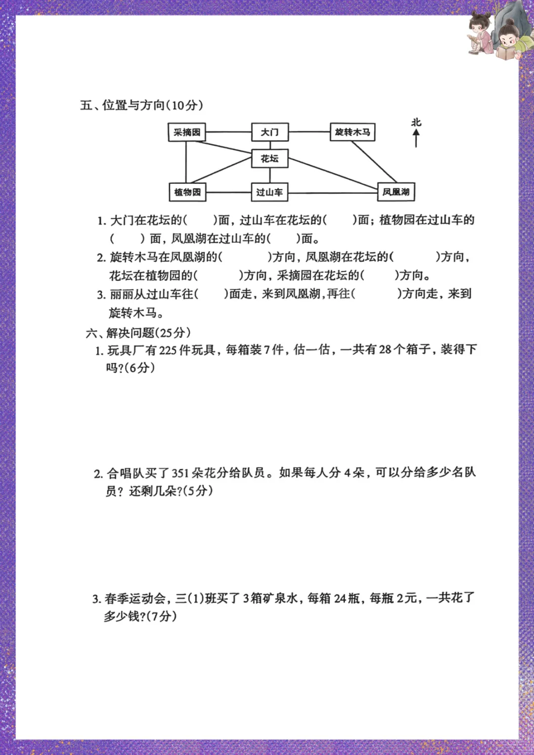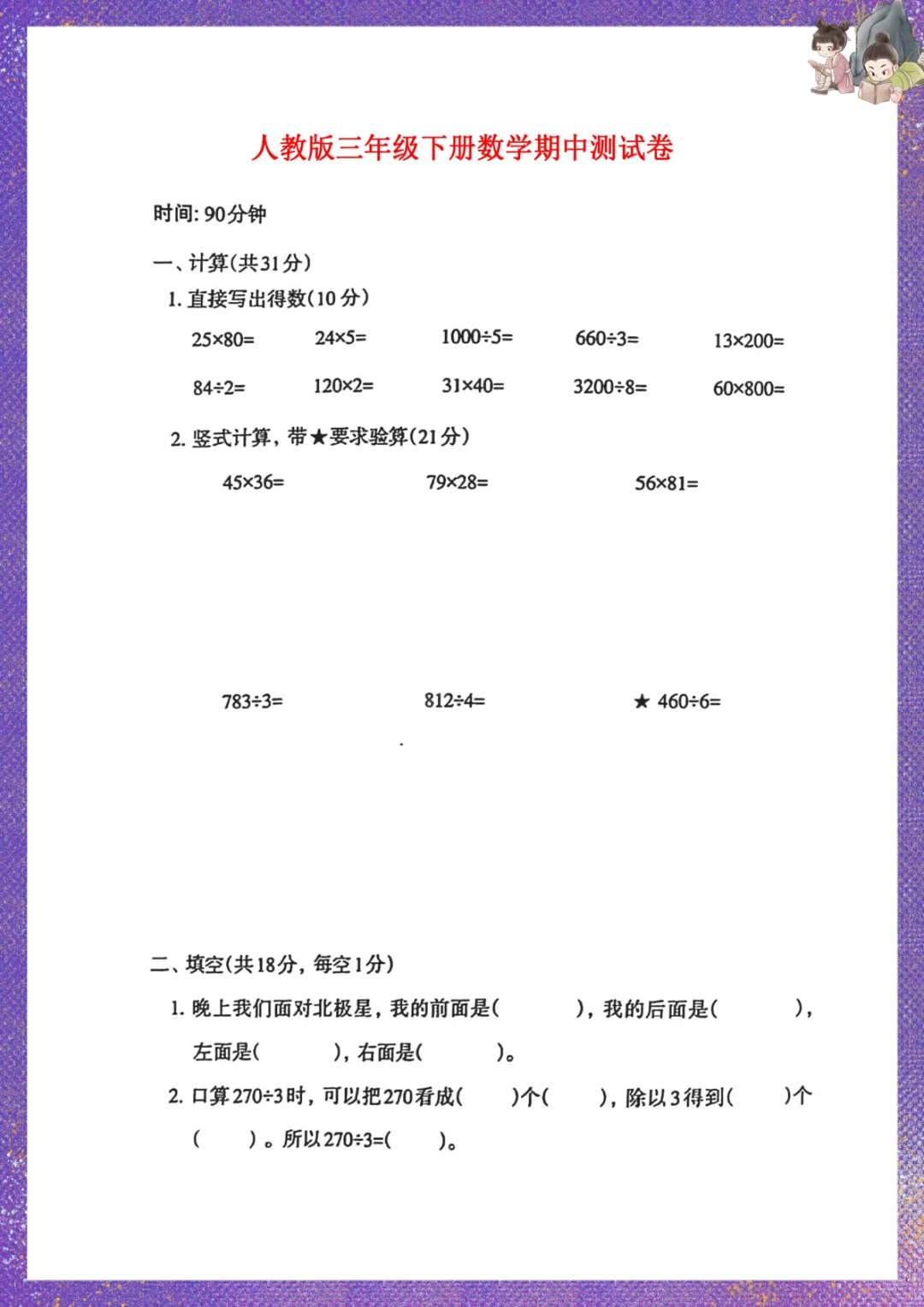 人教版三年级下册数学:期中测试卷 电子版可下载打印