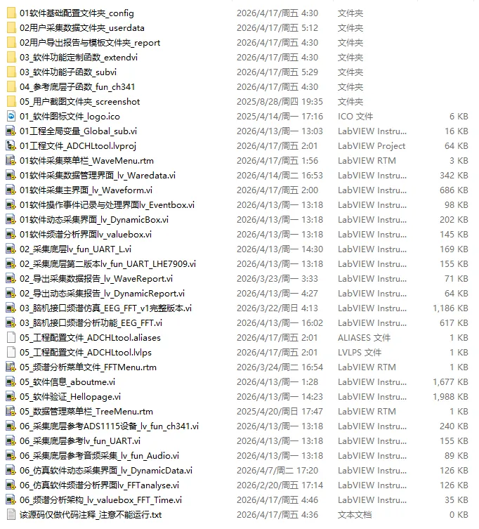 【文件夹类】01软件基础配置文件夹_config02用户采集数据文件夹_userdata02用户导出报告与模板文件夹_report03_软件功能定制函数_extendvi03_软件功能子函数_subvi04_参考底层子函数_fun_ch34105_用户截图文件夹_screenshot【工程文件类】01_软件图标文件_logo.ico01工程全局变量_Global_sub.vi01工程文件_ADCHLtool.lvproj01软件采集菜单栏_WaveMenu.rtm01软件采集数据管理界面_lv_Waredata.vi01软件采集主界面_lv_Waveform.vi01软件操作事件记录与处理界面_lv_Eventbox.vi01软件动态采集界面_lv_DynamicBox.vi01软件频谱分析界面_lv_valuebox.vi【底层驱动文件(部分)】02_采集底层_lv_fun_UART_Lvi【界面子功能】02_采集底层第二版本_lv_fun_UART_LHE7909.vi02_导出采集数据报告_lv_WaveReport.vi02_导出动态采集报告_lv_DynamicReport.vi03_脑机接口频谱仿真_EEG_FFT_v1完整版本.vi03_脑机接口频谱分析功能_EEG_FFT.vi05_工程配置文件_ADCHLtool.aliases05_工程配置文件_ADCHLtool.lvps05_频谱分析菜单文件_FFTMenu.rtm05_软件信息_aboutme.vi05_软件验证_Hellopage.vi05_数据管理菜单栏_TreeMenu.rtm【调试辅助文件类】06_采集底层参考ADS1115设备_lv_fun_ch341.vi06_采集底层参考_lv_fun_UART.vi06_采集底层参考音频采集_lv_fun_Audio.vi06_仿真软件动态采集界面_lv_DynamicData.vi06_仿真软件频谱分析界面_lv_FFTanalyse.vi06_频谱分析架构_lv_valuebox_FFT_Time.vi该源码仅做代码注释_注意不能运行.txt