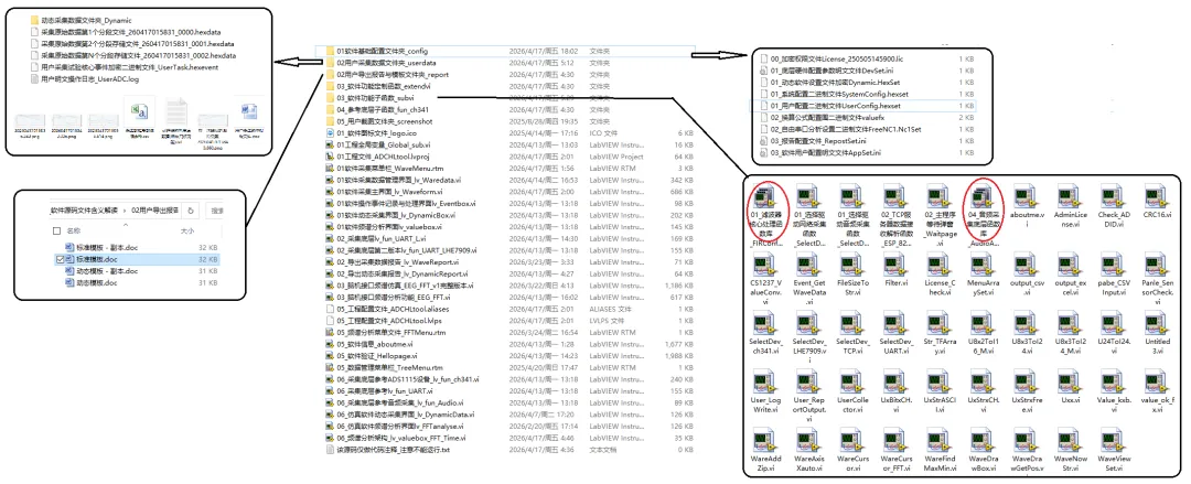 【用户数据文件夹】动态采集数据文件夹_Dynamic采集原始数据第1个分段存储文件_260417015831_0000.hexdata采集原始数据第2个分段存储文件_260417015831_0001.hexdata采集原始数据第N个分段存储文件_260417015831_0002.hexdata用户采集试验核心事件加密二进制文件_UserTask.hevent用户明文操作日志_UserADC.log【导出报告文件夹】标准模板 - 副本.doc动态模板 - 副本.doc【配置文件与子函数】00_加密权限文件License_250505145900.lic01_底层硬件配置参数明文文件DevSet.ini01_动态软件设置文件加密Dynamic.HexSet01_系统配置二进制文件SystemConfig.hexset01_用户配置二进制文件UserConfig.hexset02_换算公式配置二进制文件valuefx02_自由串口分析设置二进制文件FreeNC1.NcSet03_报告配置文件_RepostSet.ini03_软件用户配置明文文件AppSet.ini01_滤波器核心处理函数库01_选择驱动网络采集函数_SelectD...01_选择驱动音频采集函数_SelectD...02_TCP服务器数据接收解析函数_ESP_B2...02_主程序等待弹窗_Waitpage04_音频采集底层函数aboutme.vi AdminLicense.vi Check_ADDID.viCRC16.vi校验 CS1237_valueConv.vi Event_Get_WaveData.viFileSizeToStr.vi Filter.vi License_Check.viMenuArr ysSet.vioutput_csv.vi output_excel.vipabe_CSV Panele_SensorCheck.vi【打开设备窗口(部分)】SelectDev_ch341.viSelectDev_LHE7909.viSelectDev_TCP.viSelectDev_UART.vi【转换和输出类】Str_TFArray.vi U8x2To1 6_M.vi U8x3To12_4_M.viU24ToI24_vi Untitled3.viUser_Log_Write.vi User_ReportOutput.vi UserCollector.viUxBitxCH.vi UxStrxASC II.vi UxStrxFre e.viUxx.vi Value_lxb.vi value_ok_fx【波形图量化显示类】WareAdd_Zip.vi WareAxis_Xauto.vi WareCursor.viWareCur sor_FFT.vi WareFind_MaxMin.vi WaveDrawBox.viWaveDra wGetPos.vi WaveNow_Str.vi WaveView_Set.vi