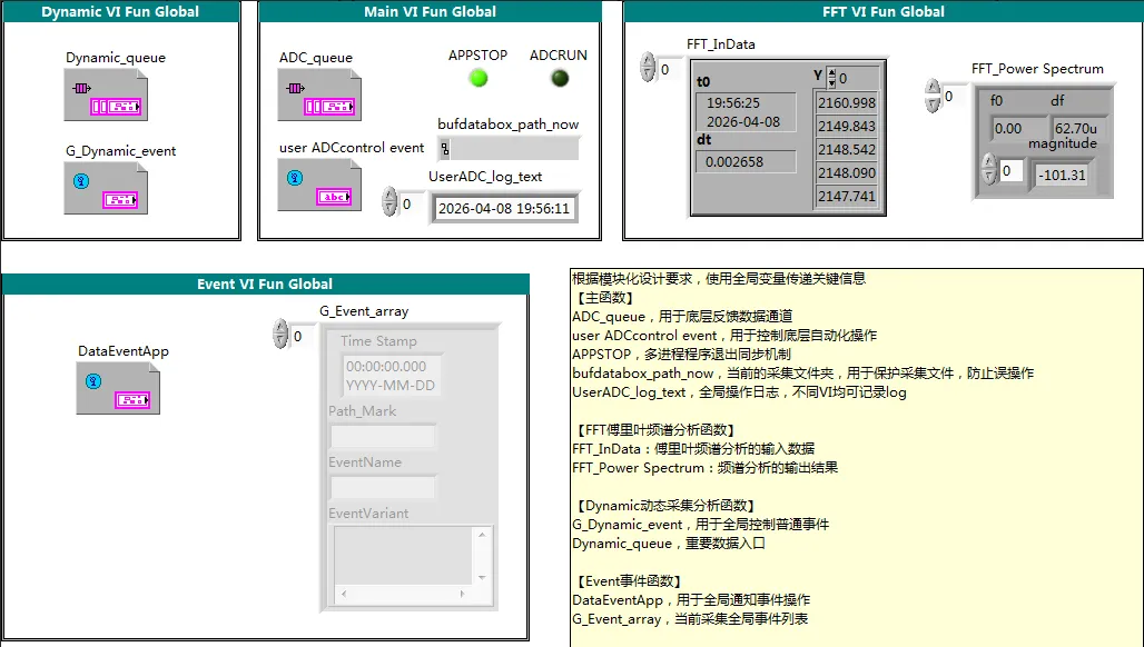 【动态触发软件界面变量 Dynamic VI Fun Global】输入队列Dynamic_queue:负责输入采集数据输出事件G_Dynamic_event:负责通知事件机制【Main VI Fun Global】ADC_queue APPSTOP ADCRUNbufdatabox_path_nowuser ADCcontrol event【FFT_Power Spectrum】【Event VI Fun Global】DataEventApp G_Event_arrayPath_Mark EventName EventVariant【主函数】ADC_queue,用于底层反馈数据通道user ADCcontrol event,用于控制底层自动化操作APPSTOP,多进程程序退出同步机制bufdatabox_path_now,当前的采集文件夹,用于保护采集文件,防止误操作UserADC_log_text,全局操作日志,不同VI均可记录log【FFT傅里叶频谱分析函数】FFT_InData:傅里叶频谱分析的输入数据FFT_Power Spectrum:频谱分析的输出结果【Dynamic动态采集分析函数】G_Dynamic_event,用于全局控制普通事件Dynamic_queue,重要数据入口【Event事件函数】DataEventApp,用于全局通知事件操作G_Event_array,当前采集全局事件列表