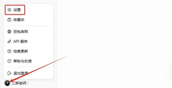 步骤一,打开豆包,然后单击左下角的个人头像,在打开的子菜单中单击“设置”,如下图所示;