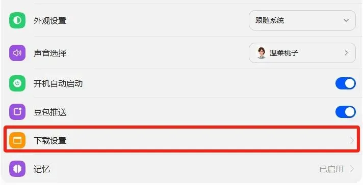 步骤二,在打开的网页版豆包中找到“下载设置”并鼠标左键单击,如下图所示;