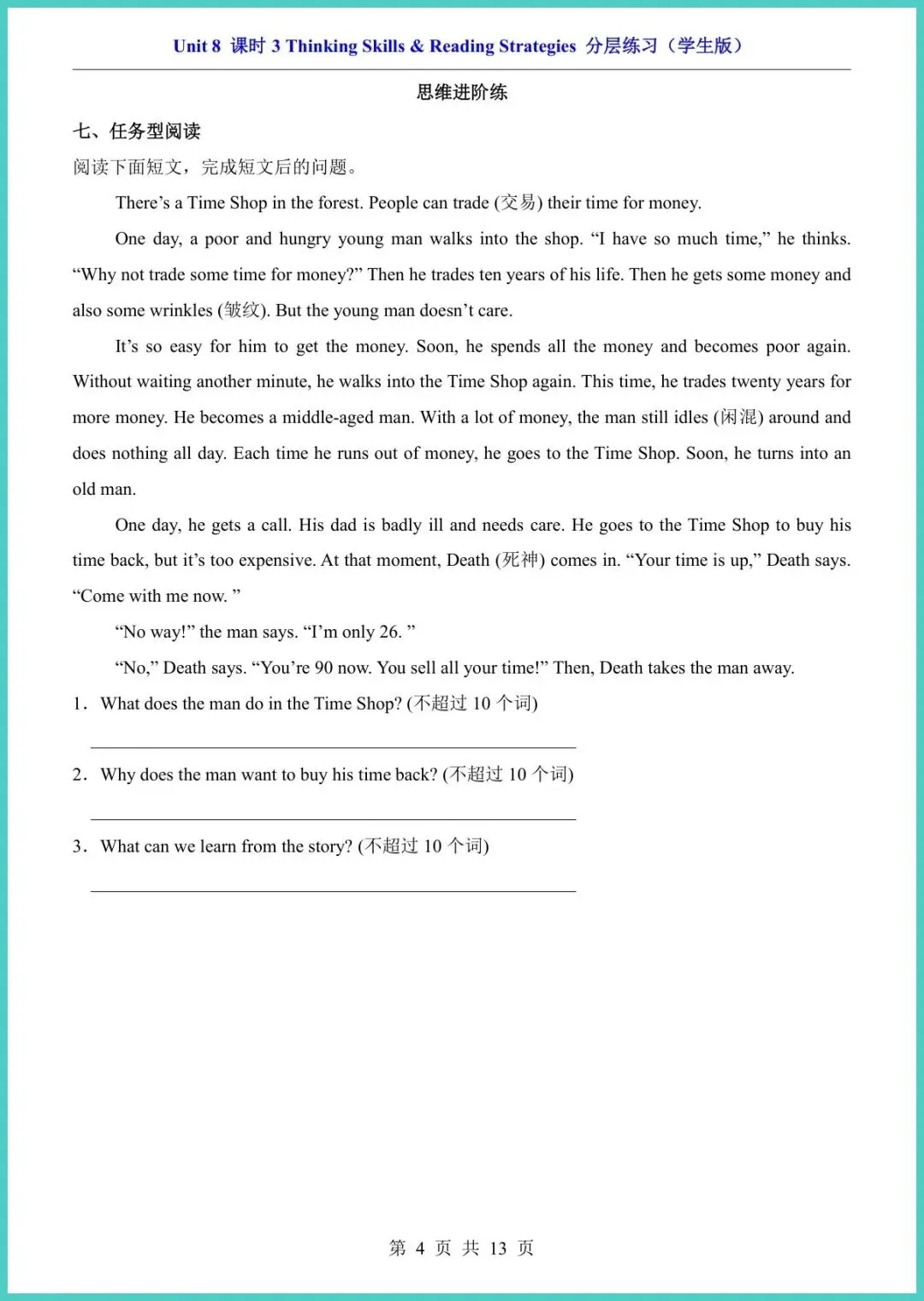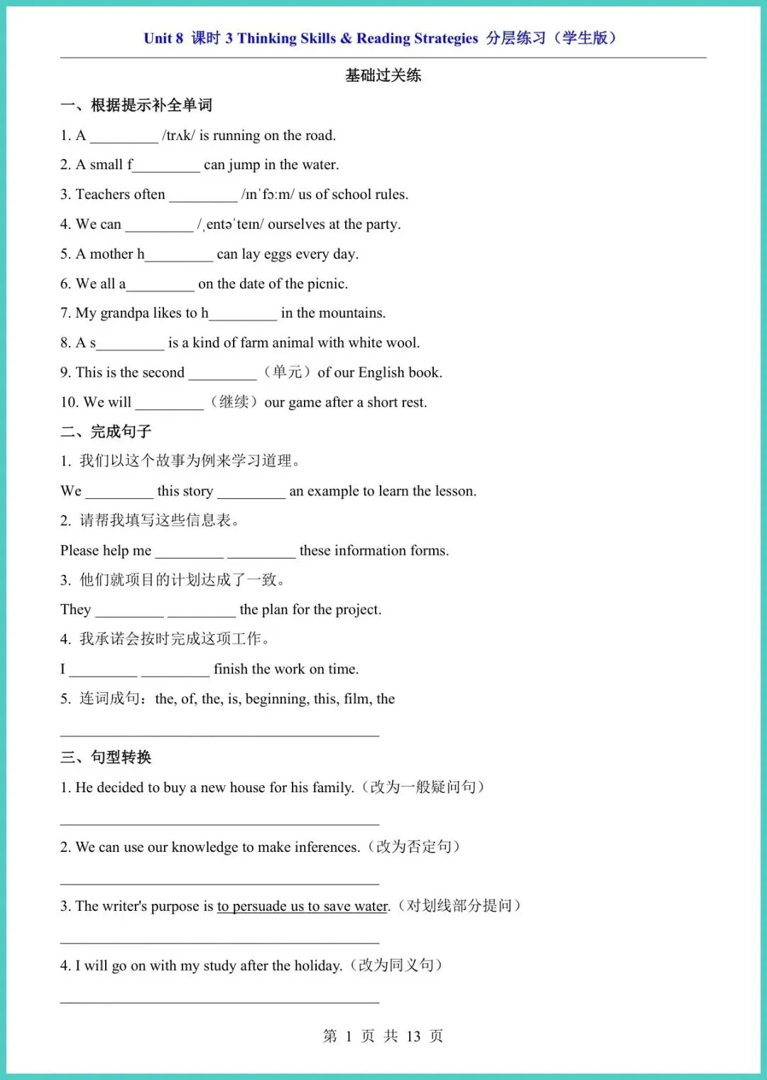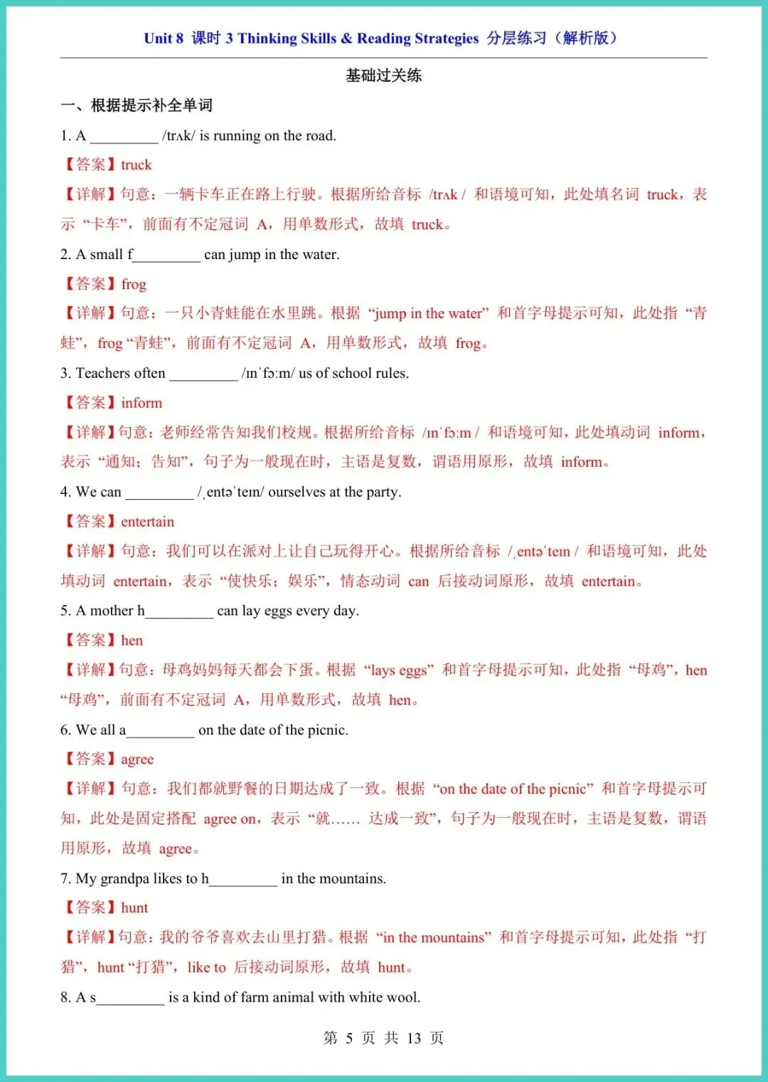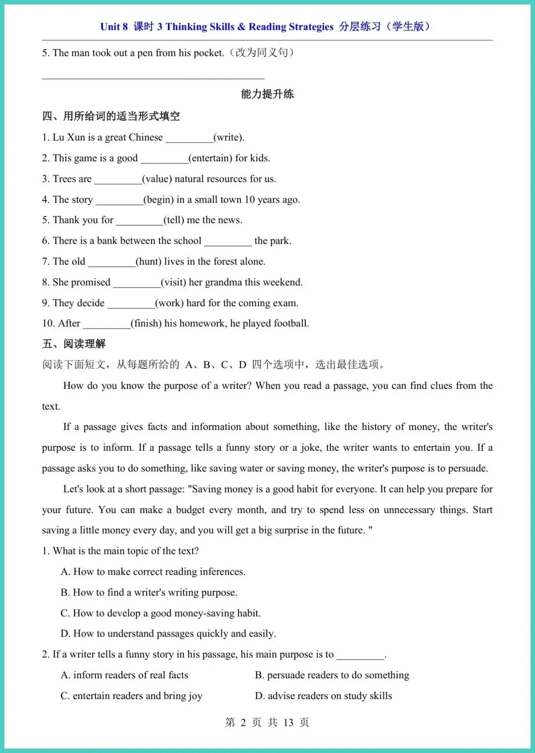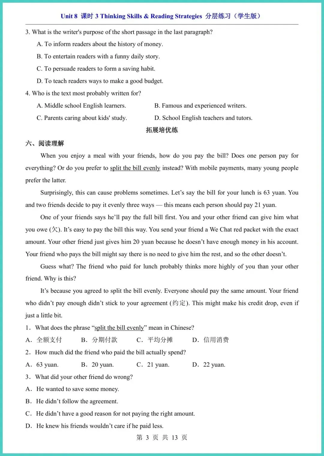 2025春仁爱版八年级下册英语Unit8课时3分层练习,13页电子版,一键打印!本套练习按“基础巩固—提升拓展—创新拔高”三级分层,精准匹配不同娃的进度:词汇句型填空、情景对话、阅读任务型训练、写作模板高分范文,题题直击考点,配答案与听力二维码,做完立刻自查。每天15分钟,口语更流利,阅读不丢分,作文有金句,期中考前提分最快!想让孩子弯道超车,现在就打印练起来,晚一天就落后一个身位!