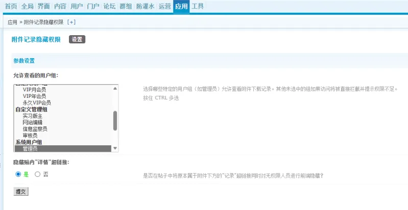 ***允许查看的用户组**:在这里勾选出依然有权力可以查看下载和消费详情的身份类型。比如:管理员组、各级版主、VIP 会员等。如果都不选,那就只有主神(adminid=1)能看。
