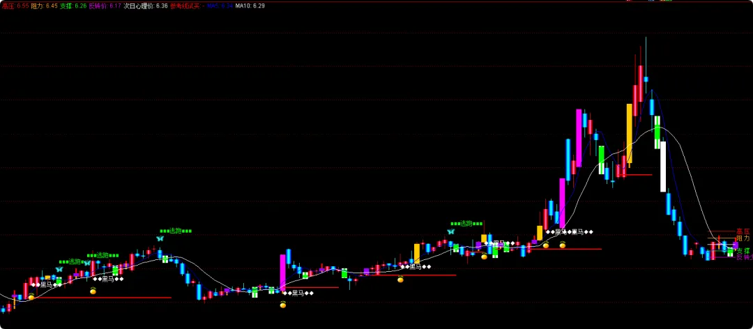 DRAWTEXT(CROSS(RSI,7.1) AND MA(V,5)>MA(V,10),L,’◆◆黑马◆◆’),COLORWHITE;