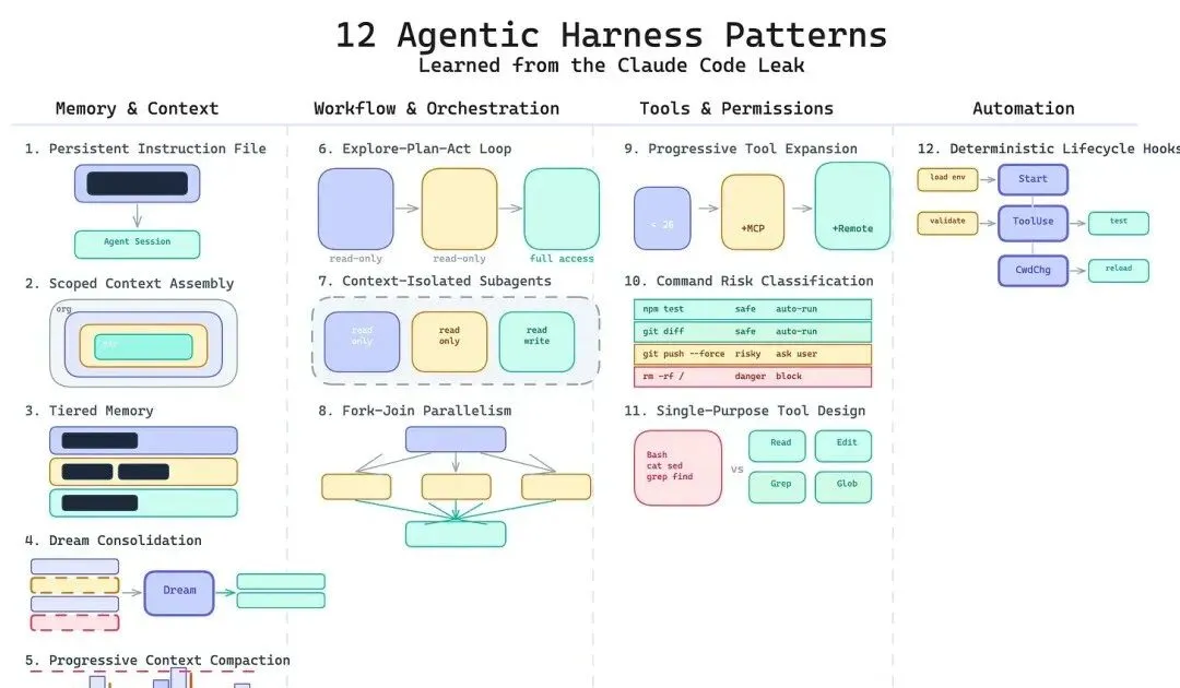 Bilgin Ibryam(《Kubernetes Patterns》《Prompt Patterns》作者)从这份源码中,提炼出12 个核心设计模式,并归为四大维度:记忆与上下文、工作流与编排、工具与权限、自动化。它们不是某个产品的专属功能,而是一套能直接复用到各类 AI Agent 的工程范式。