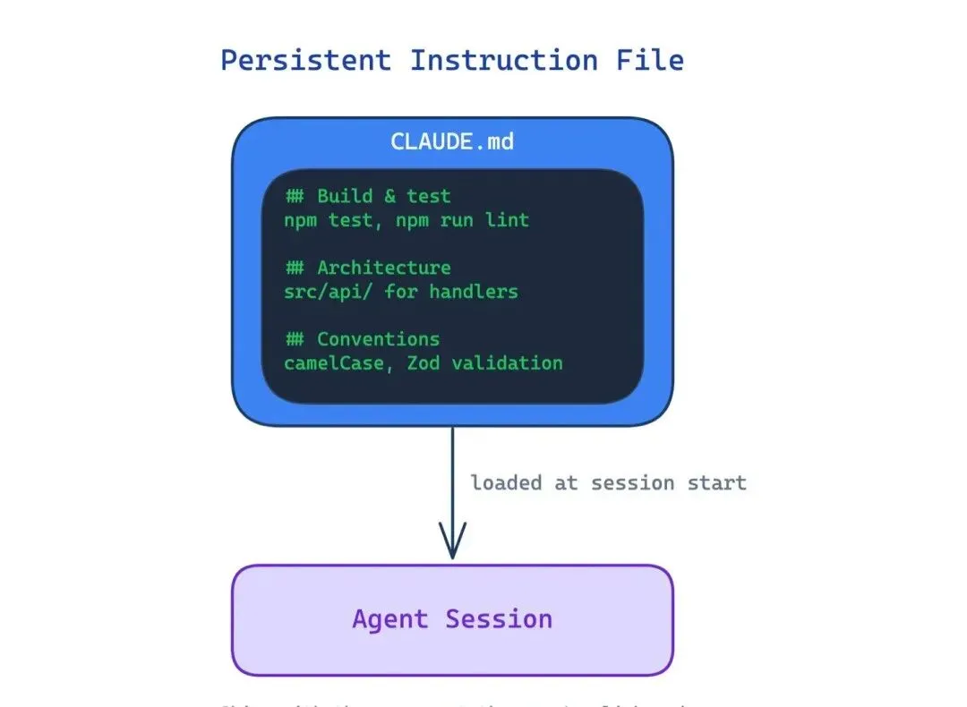 - 核心做法:在项目中放置一份固定配置文件,每次会话自动加载,内置构建命令、测试规则、架构规范、命名约定等。