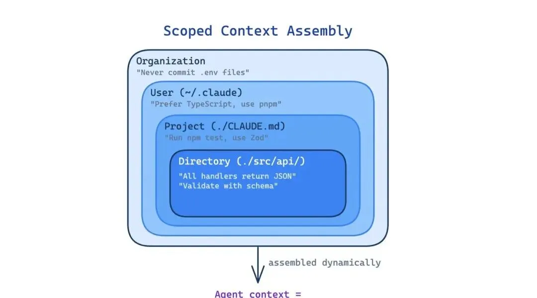 :把指令按层级拆分 —— 组织级、用户级、项目根目录、父目录、子目录,Agent 根据当前路径动态加载对应规则,支持导入复用。 - 适用场景
