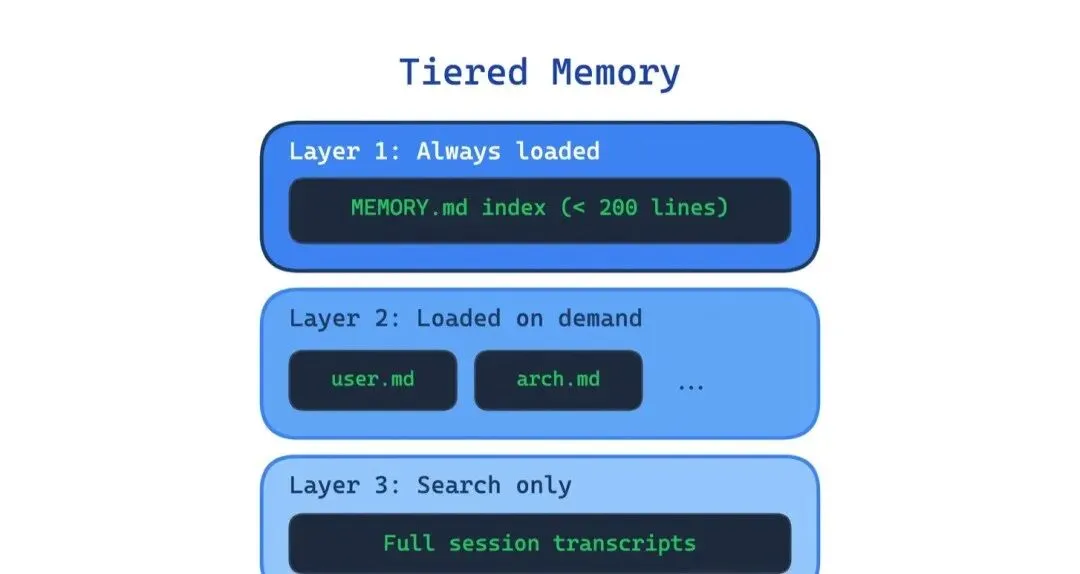 :记忆分层管理 —— 精简索引常驻上下文、当前任务相关内容按需加载、完整历史存在磁盘,需要时检索。 - 适用场景