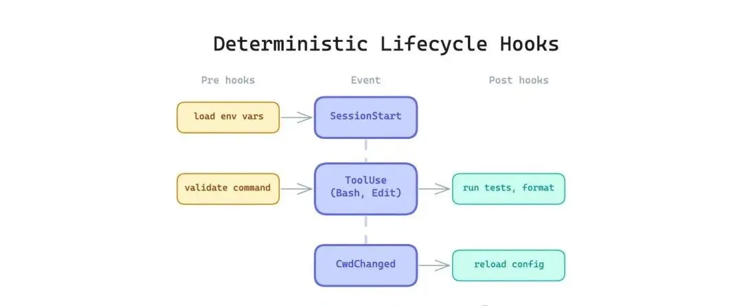 :将关键动作绑定到 Agent 生命周期节点 —— 工具调用前后、会话启动、目录切换时自动触发,完全不依赖模型记忆。 - 适用场景