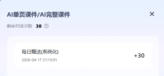 AI单页课件(生成网页)、AI完整课件。每日对话30次。每日赠送30。生成教案的质量基本在线。结构完整,教学目标、重难点、教学过程都有。