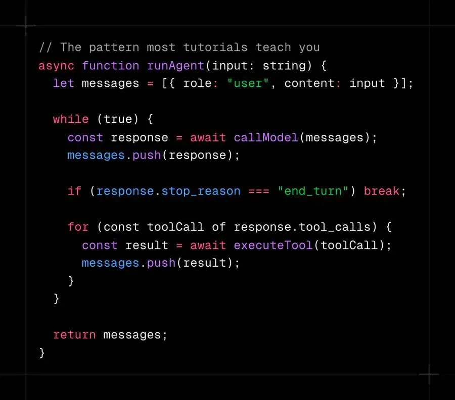 Agent 循环用异步生成器。 流式、取消、可组合性、背压:都是抽象固有的。返回完整结果的 while 循环放弃了所有四个。