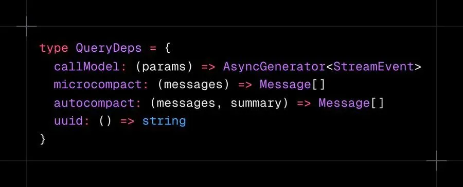 注入一个产出预设事件的 mock callModel,你就可以验证上下文溢出处理、工具失败和取消,而无需触碰真实 API。大多数 Agent 框架不可测试,因为它们将 API 调用硬编码到循环中。Claude Code 的循环是一个带有注入效果的纯状态机。