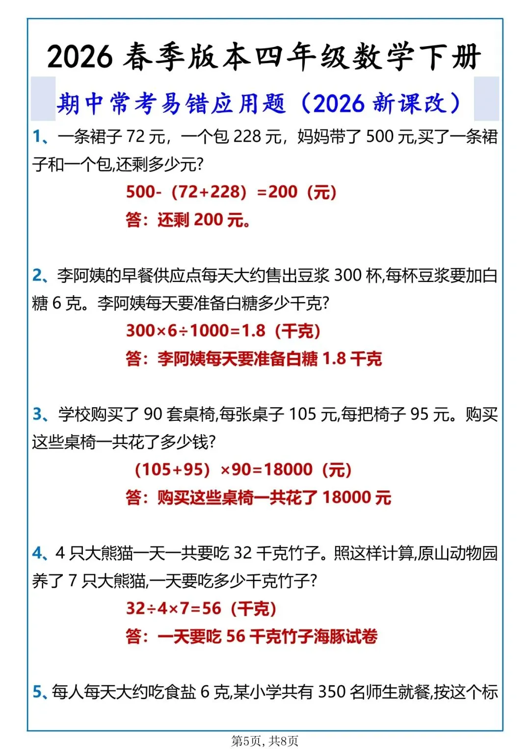 可下载丨2026春新版四年级下册数学期中常考易错应用题,电子版可打印