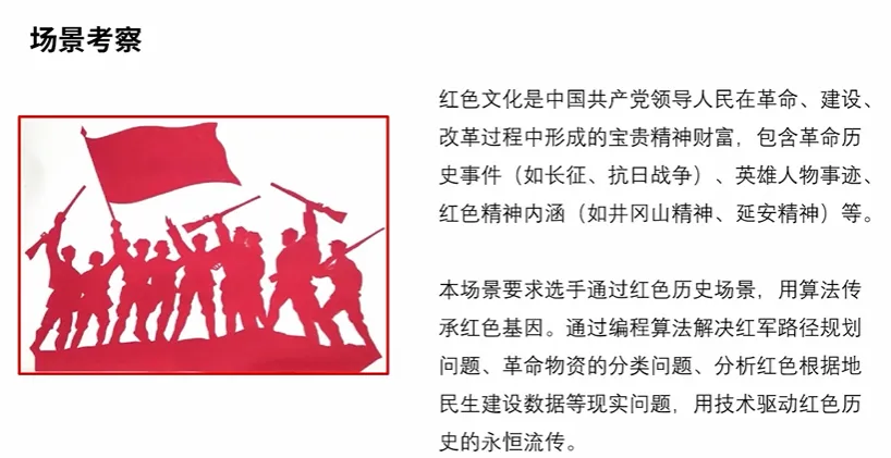 这个场景主要是考察红色文化方面,红色文化的定义是中国共产党领导人民在革命、建设、改革过程中形成的宝贵精神财富,涵盖革命历史事件(如长征、抗日战争)、英雄事迹、红色精神(如井冈山精神、延安精神)等,题目会围绕这些方面。