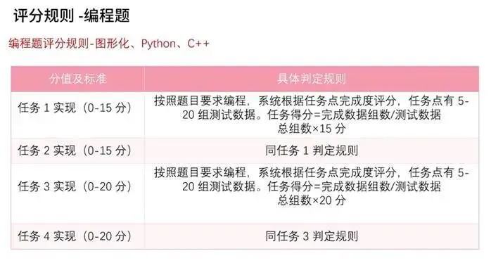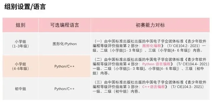 编程语言的话小学组1-3年级图形化和py,4-6年级py和C++,初中组也是py和C++,能力对标要求大家也可以在官网查到,想要得到高分的话就要把相关的内容全部掌握。