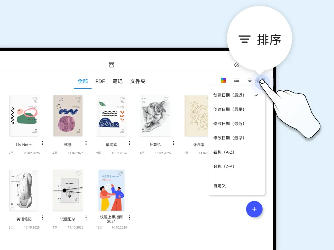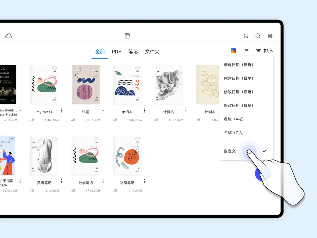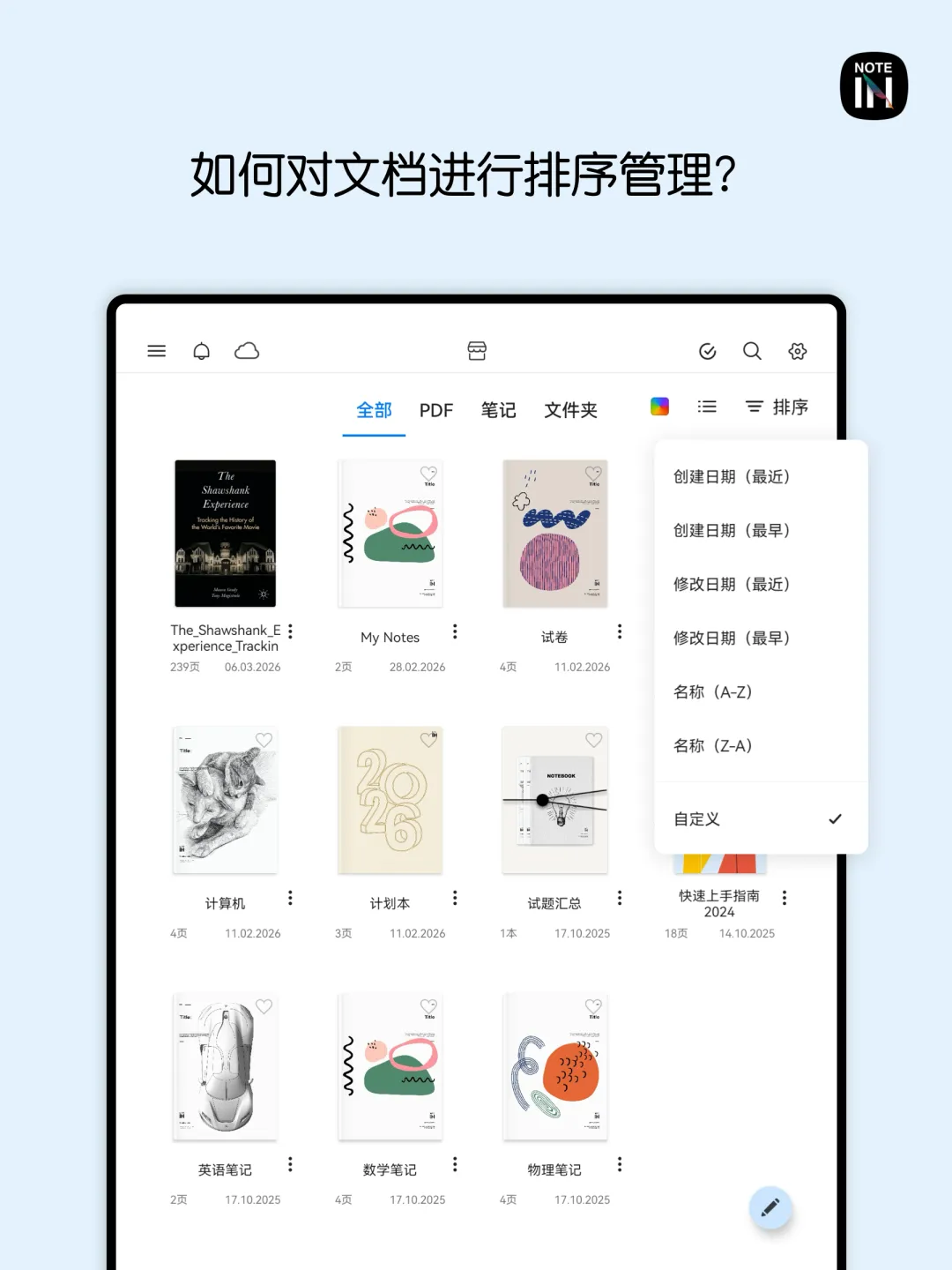 新手教程|如何对文档进行排序管理? 01 选择自动排序方式 在Notein软件首页右上角操作区域中,您可以看到“排序”按钮,点击后就可以选择自动排序的方式,目前我们支持按创建日期、修改日期以及名称来排序,您可以按照自己的使用需求来切换排序方式。 PS:默认排序为创建日期(最近) 02自定义手动排序 如果您需要自己手动来对文档进行排序管理,您需要先切换至“自定义”排序模式。 切换完成后,您可以长按拖动文档至需要调整的位置,松手后即可调整完成。 具体操作方式见下方视频: 已关注 关注 重播 分享 赞 视频详情 如何对文档进行排序管理你学会了吗?💡 欢迎你在评论区提出对我们应用的宝贵建议🌹 #Notein#Notein一笔记