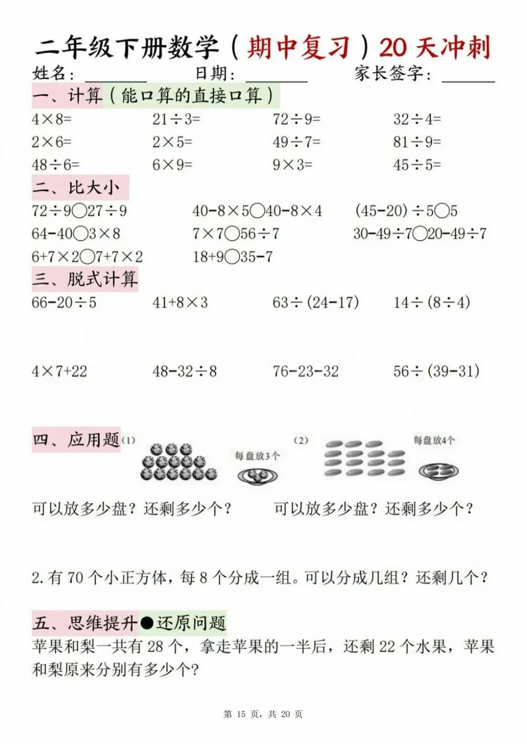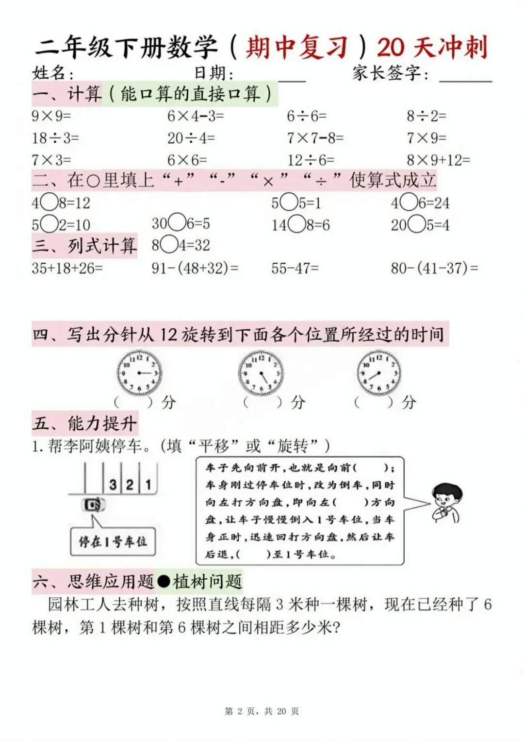 26春通用版二年级下册数学《期中复习20天冲刺》共20页,电子版可打印