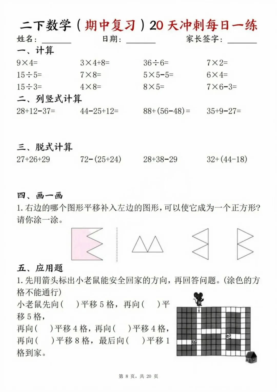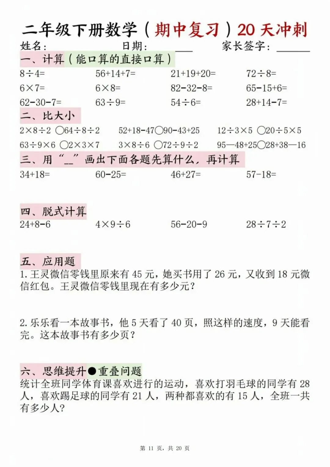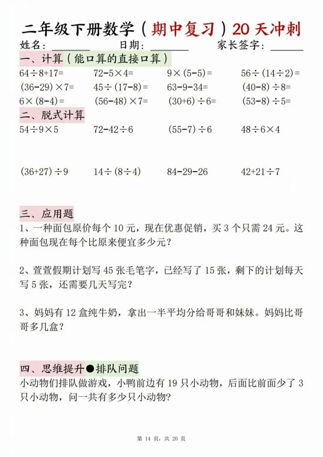 26春通用版二年级下册数学《期中复习20天冲刺》共20页,电子版可打印。该练习包含口算、脱式竖式计算、应用题、思维拓展题等专项练习。帮助孩子巩固所学知识点,查缺补漏,提升学习成绩。有需要的家长快打印给孩子练一练。