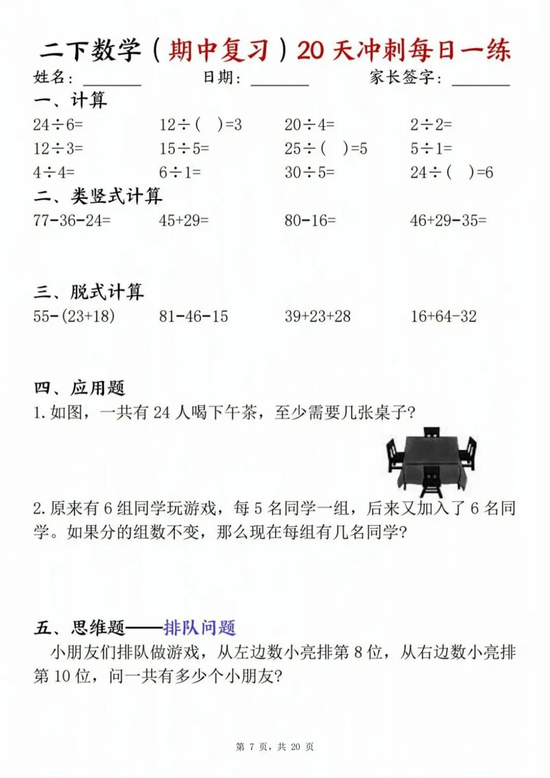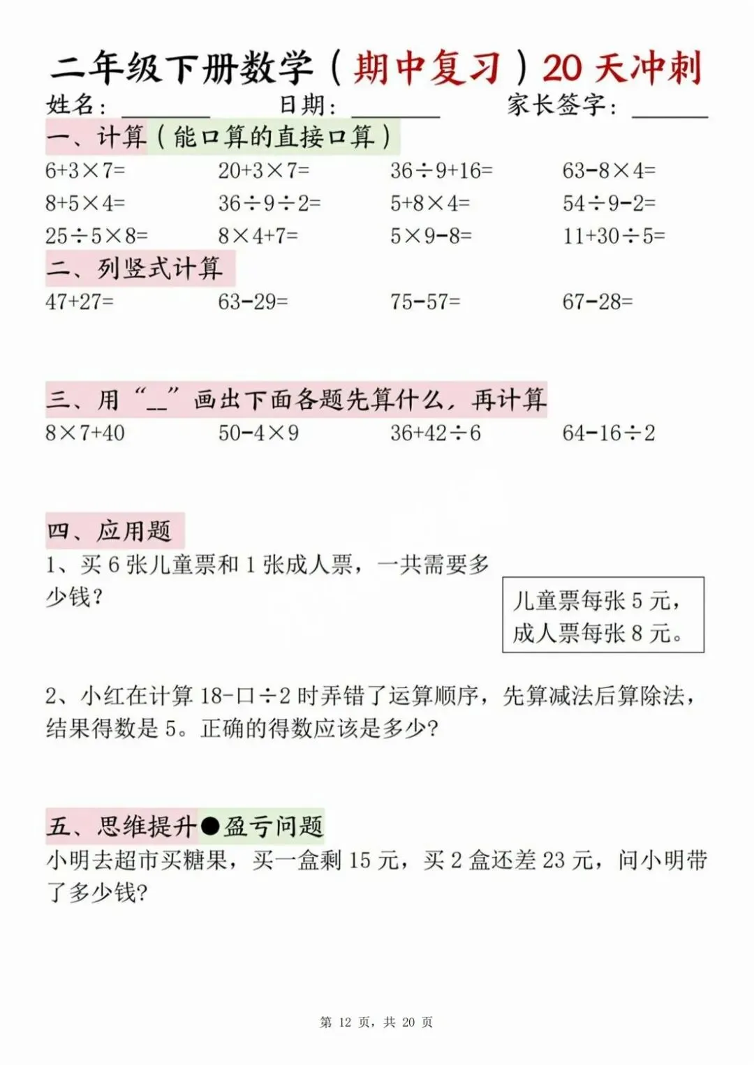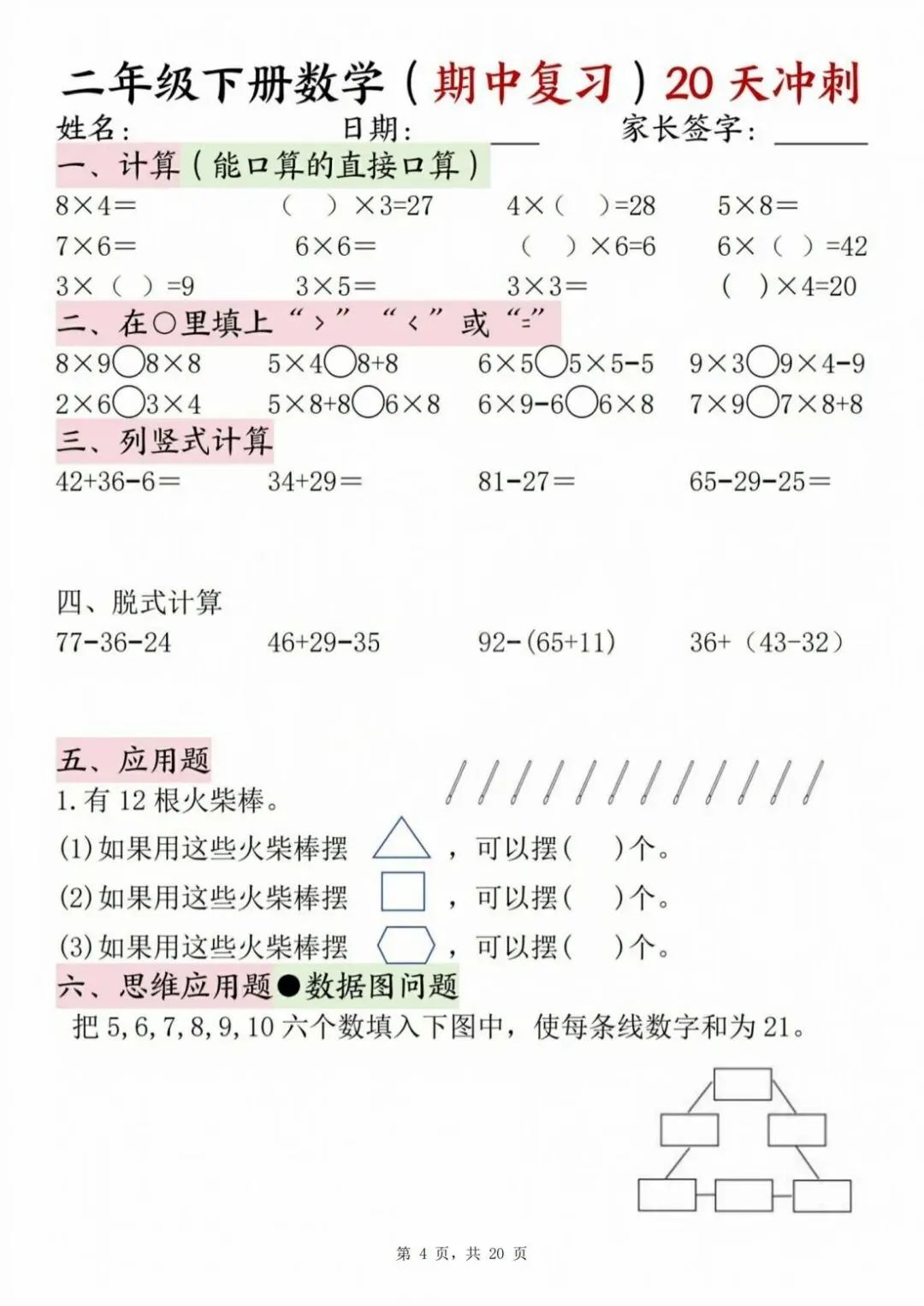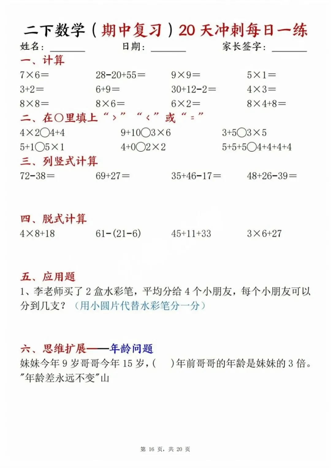 26春通用版二年级下册数学《期中复习20天冲刺》共20页,电子版可打印。该练习包含口算、脱式竖式计算、应用题、思维拓展题等专项练习。帮助孩子巩固所学知识点,查缺补漏,提升学习成绩。有需要的家长快打印给孩子练一练。