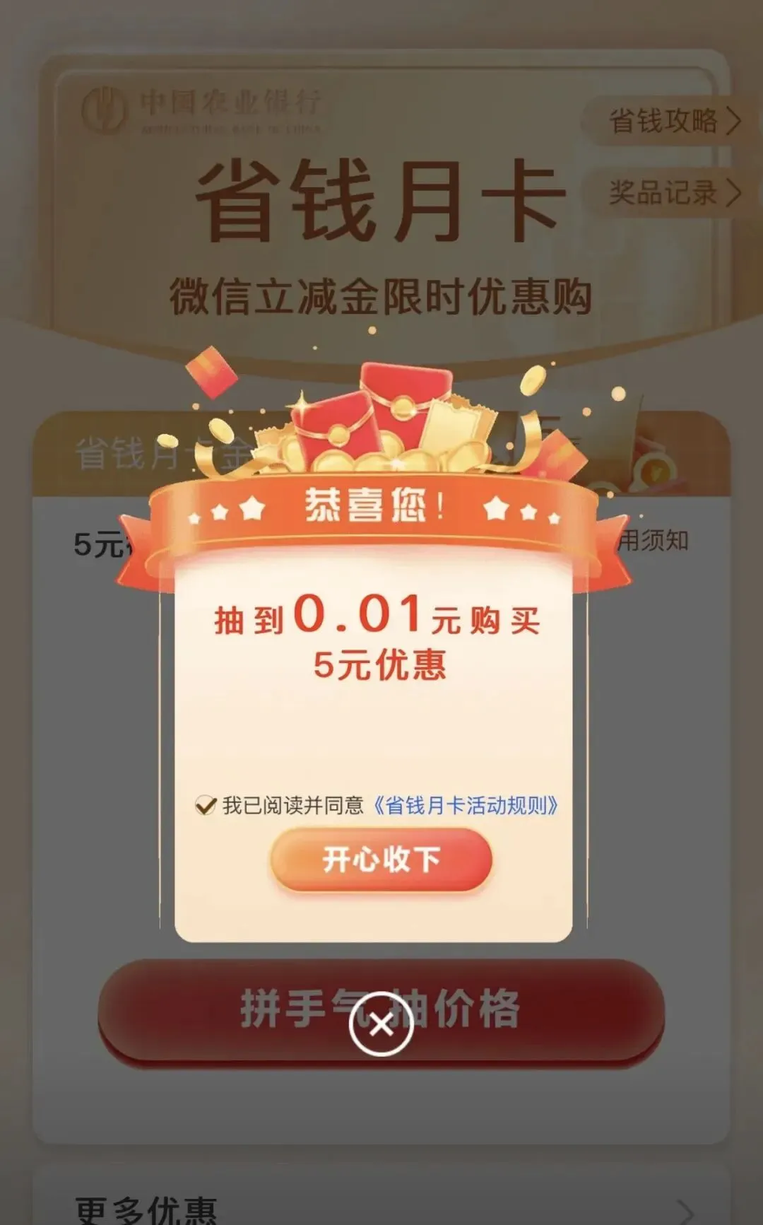 家人们在农行APP首页搜索“省钱月卡”,然后有个幸运盒,打开是0.01元购5元优惠。