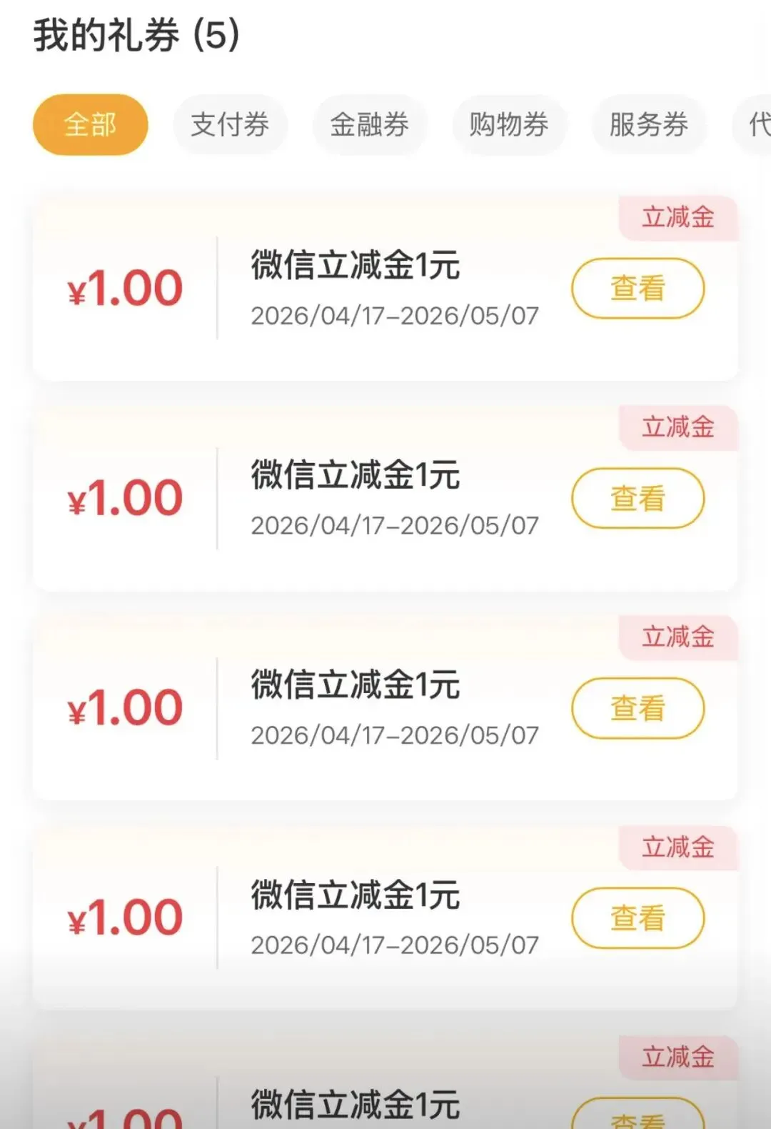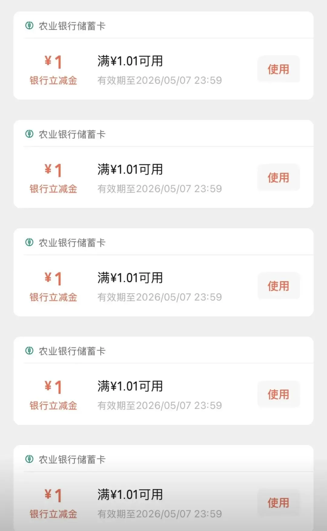 5个1元微信支付红包,有效期是20天,有农行APP的可以试一下。