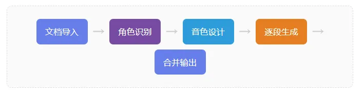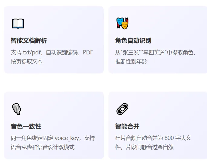 这是最核心的难点。每个角色绑定一个 voice_key,由角色名 + 性别 + 年龄 + 音色指令组成。同角色在任何位置都走同一条音色路径: