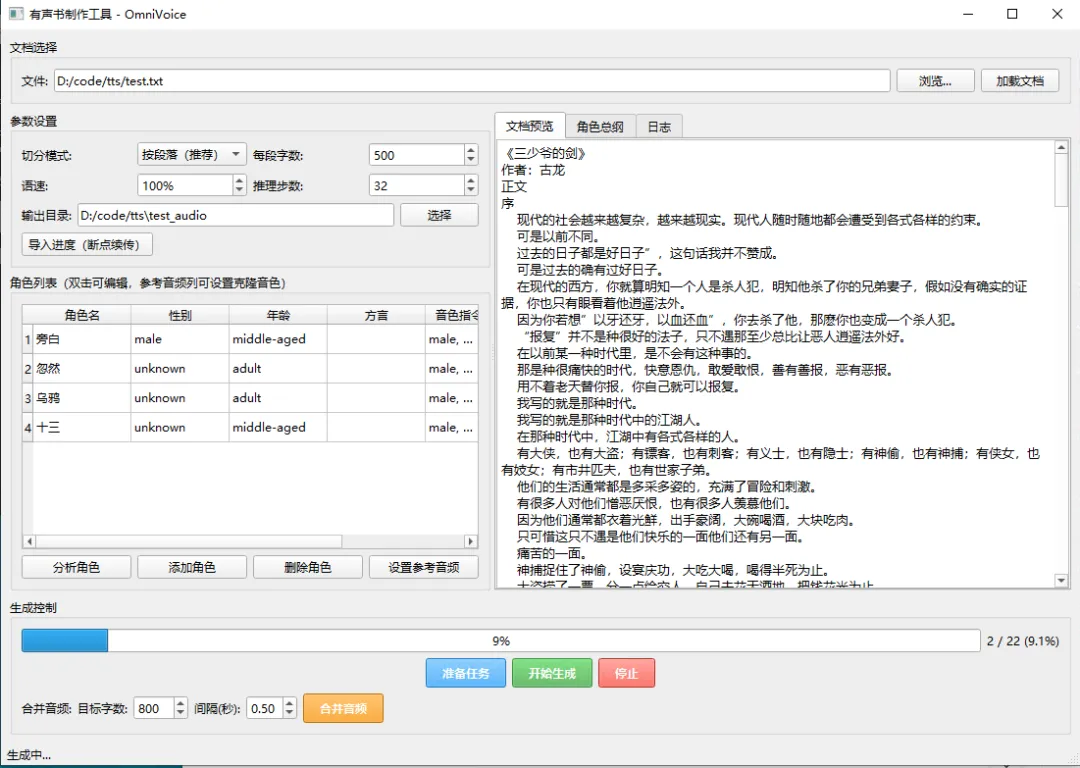 工具会先把 “张三摇了摇头,道:” 标准化为 “张三道:”,然后拆成三个独立片段:旁白、张三对话、李四对话,各自用对应角色的音色生成。