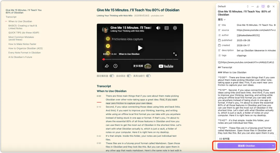 既用 Obsidian 又喜欢在 YouTube 上看教程、访谈、学习内容的小伙伴。 可以试试 Obsidian Web Clipper 上周更新的功能:
